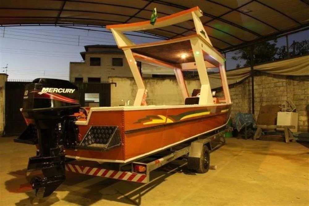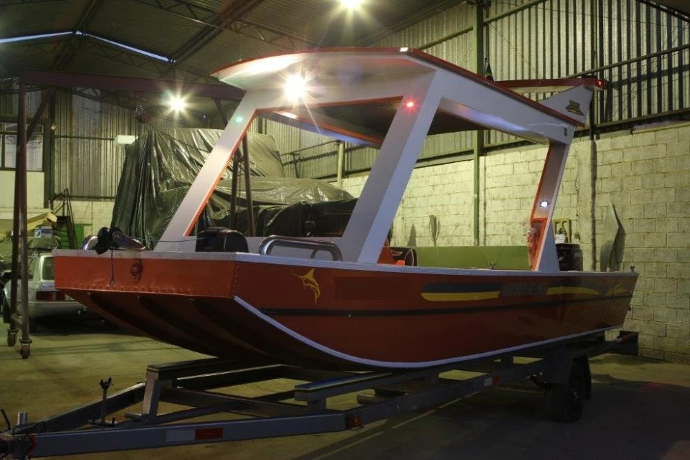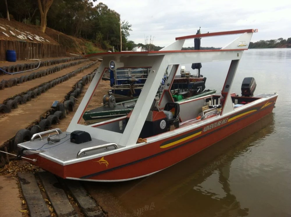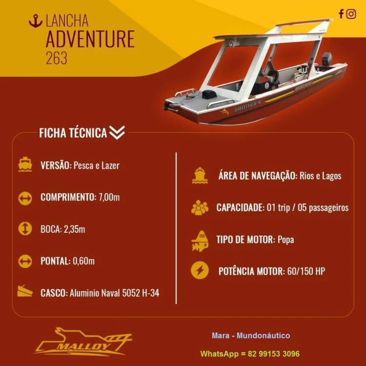 Barco de alumínio Malloy Adventure 263 - Destinado à prática da pesca esportiva e lazer em rios e lagos, com toda segurança e conforto. Possui 7m de comprimento e 2,35m de boca, e utiliza motores de popa de 60 até 150 hp. Feito sob encomenda. O interior pode ser personalizado consoante as necessidades do cliente. FOTOS ILUSTRATIVAS.