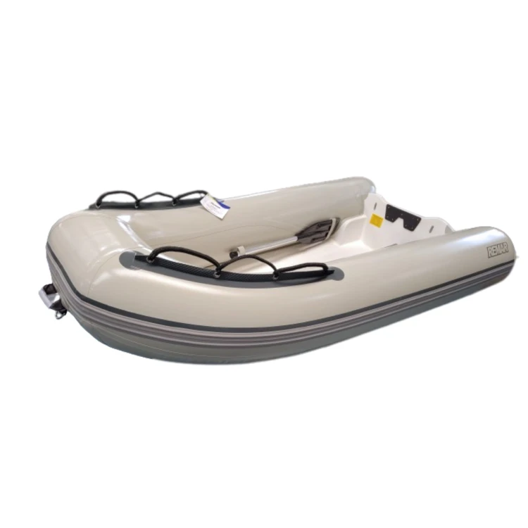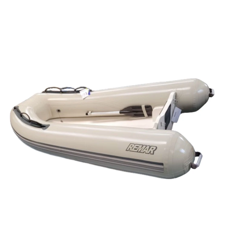 O modelo RM 2.40 F sai de fábrica com: 02 compartimentos de ar independentes com uma válvula em cada; 03 alças de transporte, sendo 02 na popa (cones) e 01 na proa com 01 d´ring (lado externo); 02 Suportes em PVC (alças de segurança) com ilhoses metálicos e corda, instalados em ambos os bordos da embarcação (parte superior dos tubos); Perfil lateral colado ao redor do flutuador para proteção na atracação; 02 suportes para fixar os remos na parte interna do bote; 01 Bujão (dreno) de saída para água; Casco em fibra de vidro com ponto de reboque na proa do lado externo do casco; 01 Ponto de içamento na parte interno do casco, próximo a proa; 02 ganchos U em inox instalados na popa de fibra para içamento; Espelho de popa de borracha preta na parte interna para proteção; Espelho de popa de lona de PVC preta na parte externa para proteção; 01 Par de remos; 01 Kit reparos; 01 Bomba de inflar; Etiqueta de identificação com as especificações do bote; Termo de garantia e manual de instruções. Especificações Gerais: O RM 2.40F é um dos modelos preferidos para apoio de embarcações maiores. Utilizamos PVC náutico reforçado (com tela interna com tecido de fios de poliéster de alta tenacidade), para a construção do tubo inflável oferecendo qualidade, resistência, durabilidade e impermeabilidade. O sistema de fabricação é com solda eletrônica nas emendas. Este sistema dispensa o uso de cola, pois funde uma peça a outra, tornando as partes inseparáveis, oferecendo uma maior durabilidade. O casco é de fibra de vidro que garante sua ótima navegabilidade. Especificações Técnicas: Comprimento total: 2,40 m. Comprimento interno: 1,75 m. Largura total: 1,45 m. Largura interna: 0,65 m. Diâmetro dos flutuadores: 0,37 m. Quantidade de câmaras: 02 (independentes). Peso sem motor: 39 kg. Motorização recomendada: até 6 hp Capacidade de pessoas: até 4 passageiros. Capacidade total de carga: 420 kg. Tamanho do bote embalado: 1,90 x 1,20 x 0,60. Garantia 2 anos para uso recreativo ou 1 ano para uso comercial e militar. FRETE DE ENVIO FOB, POR CONTA DO CLIENTE, ENTRAR EM CONTATO COM A INFLAVEIS REMAR.