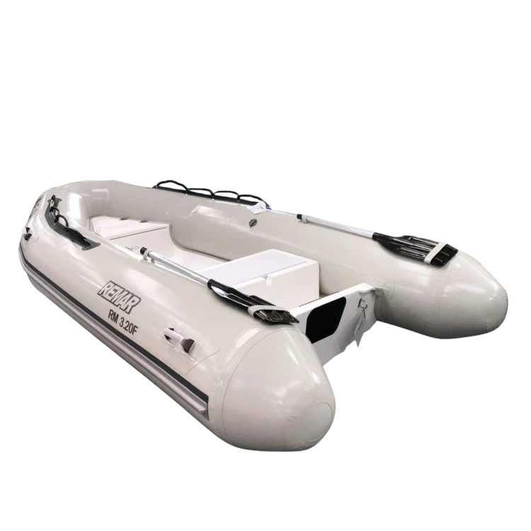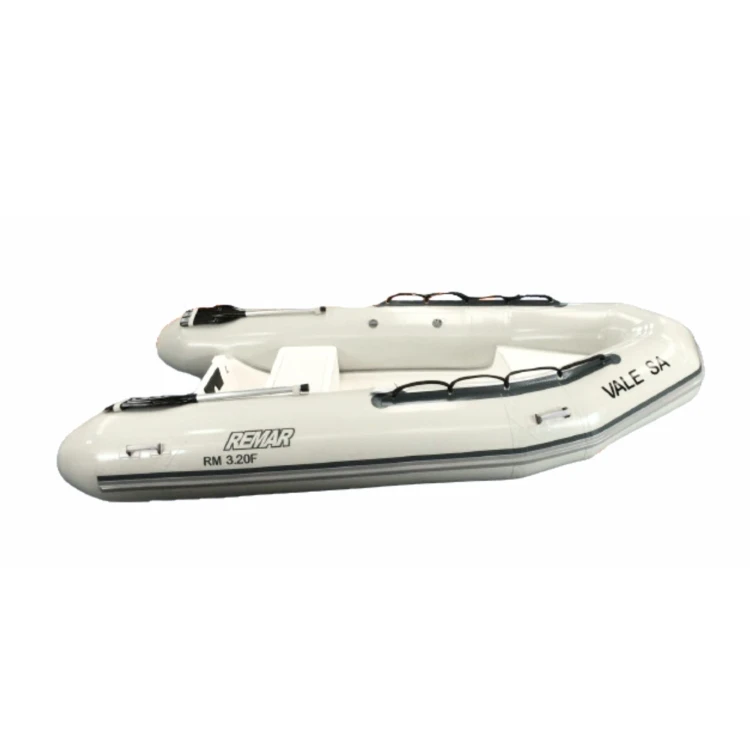 O modelo RM 3.20 F sai de fábrica com: 03 compartimentos de ar independentes com uma válvula em cada; 04 alças de transporte, sendo 02 na lateral popa e 02 na lateral mais próximo a proa; 02 Suportes em PVC (alças de segurança) com ilhoses metálicos e corda, instalados em ambos os bordos da embarcação (parte superior dos tubos); Perfil lateral colado ao redor do flutuador para proteção na atracação; 02 suportes para fixar os remos na parte interna do bote; 02 Bujões (dreno) de saída para água; Casco em fibra de vidro; 01 Caixa de âncora com tampa na proa sem estofamento; 01 Banco de popa de fibra de vidro tipo caixa sem estofamento; 03 ganchos U em inox instalados, sendo 02 na popa de fibra para içamento e 01 no casco na proa no lado externo para reboque; Espelho de popa rígido na cor preta na parte interna para proteção; Espelho de popa de lona de PVC preta na parte externa para proteção; 01 Par de remos; 01 Kit reparos; 01 Bomba de inflar. Especificações Gerais: Nosso modelo RM 3.20F é ideal tanto para trabalho, lazer ou uso militar. Utilizamos PVC náutico reforçado, (com tela interna com tecido de fios de poliéster de alta tenacidade), para a construção do tubo inflável, oferecendo qualidade, resistência, durabilidade e impermeabilidade. O sistema de fabricação é com solda eletrônica nas emendas. Este sistema dispensa o uso de cola, pois funde uma peça a outra, tornando as partes inseparáveis, oferecendo uma maior durabilidade. O casco é de fibra de vidro que garante sua ótima navegabilidade. Especificações Técnicas: Comprimento total: 3,20 m. Comprimento interno: 2,20 m. Largura total: 1,70 m. Largura interna: 0,80 m. Diâmetro dos flutuadores: 0,45 m. Quantidade de câmaras: 03 (independentes). Peso sem motor: 60 kg. Motorização recomendada: de 15 à 30 hp. Capacidade de pessoas: até 5 passageiros. Calado carregado: 0,20 m. Calado leve: 0,10 m. Pontal: 0,68 m. Capacidade total de carga: 750 kg. Fundo: Fibra de vidro em “V” reforçado com longarinas e cruzetas. Garantia 2 anos para uso recreativo ou 1 ano para uso comercial e militar. FRETE DE ENVIO FOB, POR CONTA DO CLIENTE, ENTRAR EM CONTATO COM A INFLAVEIS REMAR.