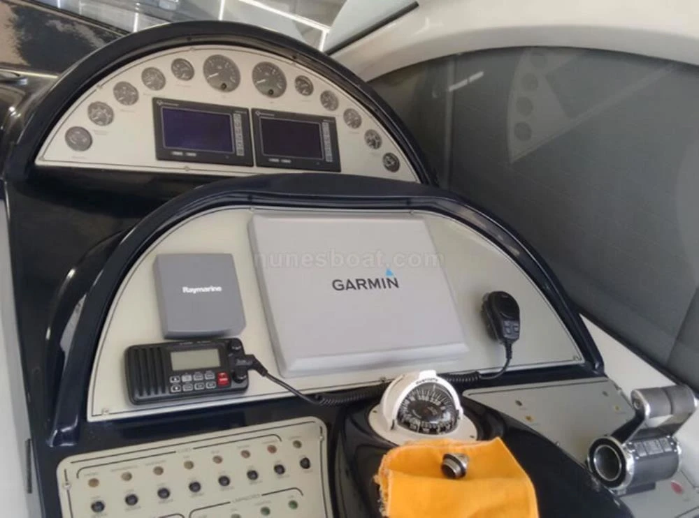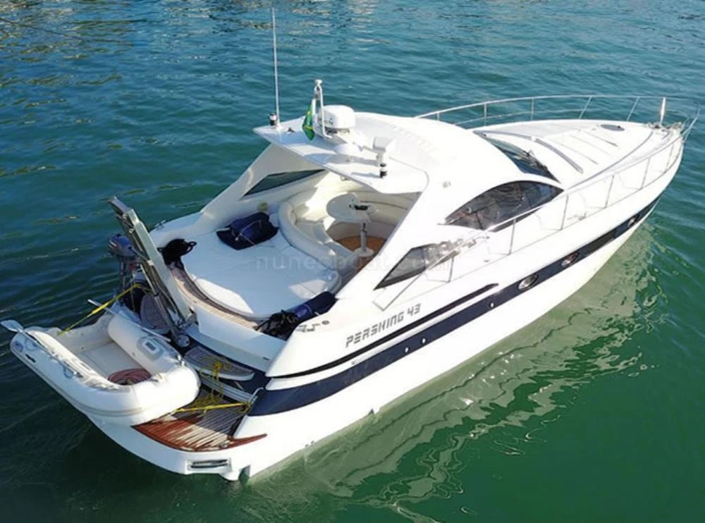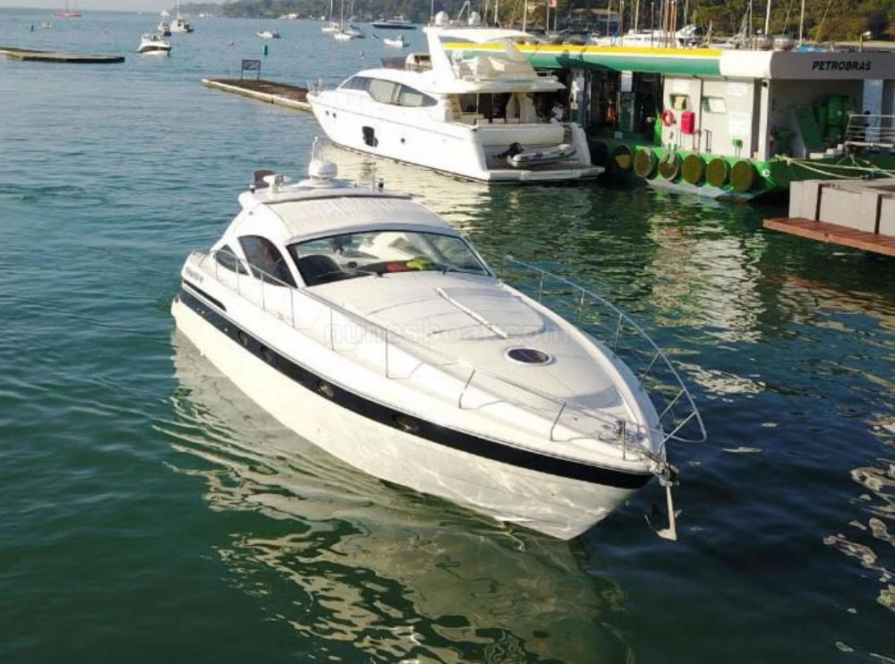 CÓD 7580 PERSHING 43: 2004, 2 x man 620hp, diesel, pé de galinha, 1000hs de uso, 27 top e 20 cruzeiro, (2) âncoras, antena de vhf, ar, (6) baterias, boiler, bomba de água doce, (3) bombas de porão, bússola, buzina, capota c/fechamento total, carreta de encalhe, cd player, churrasqueira, chuveiro, (15) coletes, comando eletrônico, (7) defensas, defletor de radar, direção hidráulica, dvd player, (6) extintores, farol, flaps hidráulicos, fogão elétrico 2 bocas, freezer, geladeira, gerador onan 8 kva, gps, guincho elétrico, inversor, microondas, motor aux. yamaha 4hp, piloto automático, rádio vhf, (2) sanitários elétricos, sonda c/plotter, strobolight, tv, tomada de cais, vídeos... TEL/ZAP (13)99706-0395
