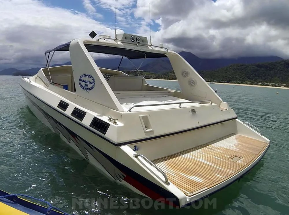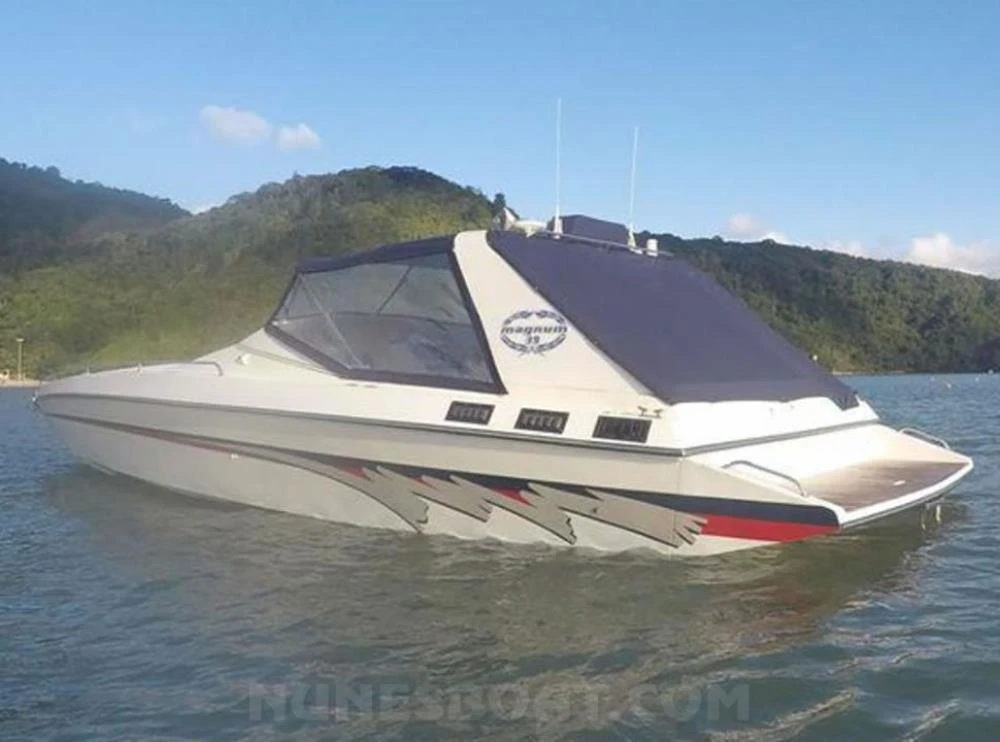 CÓD 6700 MAGNUM 39: 1999, 2 x vp kad44 260hp, diesel, 38 top e 26 cruzeiro, rabetas vp 295 dp, âncora inox, antena de vhf, (3) baterias 150amp, bomba de água doce, bomba de porão, bússola, buzina, capota c/fechamento total, carregador de bateria, carreta de encalhe, chuveiro, (10) coletes, direção hidráulica, (2) extintores, foguetes, geladeira, gerador fischer 4.5kva, gps c/plotter, guincho elétrico, luzes de led, microondas, (2) rádio vhf, sanitário elétrico, som, strobolight, teca original na popa, tomada de cais... (13)99706-0395 Tel/Zap