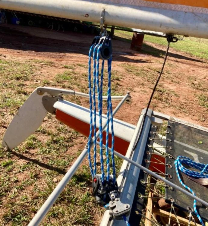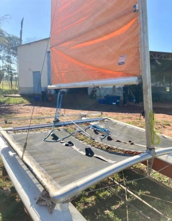 Nome: Calebe Estado do veleiro é bom Vela Dombrowsky colorida ok Talas em nylon ok. Trampolim vazado ok Stays novos ok Bananas ok Carreta de desencalhe ok Completo para velejar! Descrição Calebe, veleiro catamarã (duplo casco) usado em excelente estado, com vela colorida super conservada, carreta não emplacada e não licenciada, nunca navegou no mar, somente na represa de Ilha Solteira. Disponível para retirada na Fazenda Santa Cecilia em Aparecida do Tabuado-MS. Barco muito bom, ligeiro e divertido completo para velejar. Cascos assimétricos, que eliminam a necessidade de bolinas, facilitando a entrada e saída de praias. Para iniciantes, teria que pegar uma certa experiência com alguém.