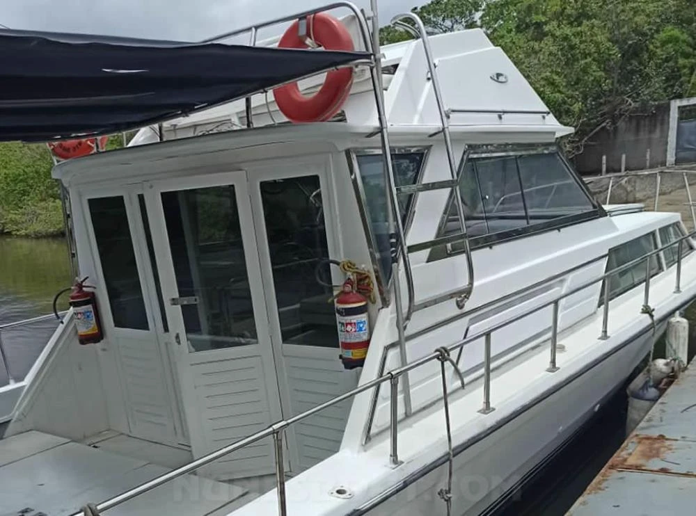CÓD 5351 CARBRASMAR 32: modelo pesca, c/flybridge, 1986, 2 x mb 352a 250hp, diesel, pé de galinha, 615hs, 30 top e 18 cruzeiro, âncora, antena de vhf, (3) baterias, bomba de água doce, (4) bombas de porão, (2) bússolas, buzina, carreta de encalhe, churrasqueira, chuveiro de popa, (16) coletes, deck alongado em 1.10m, (2) extintores, faróis c/controle remoto, gps c/plotter, inversor 1.500w, rádio vhf, sanitário comum, som, strobolight, tapeçaria nova, toldo... F/c. Nunes (13)99706-0395 Tel/Zap