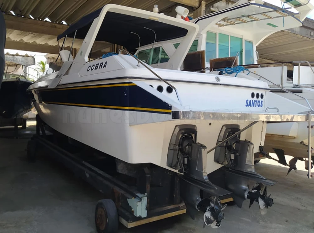 CÓD 5300 COBRA MONTE CARLO 32: 1989, 2 x vp aqad41 200hp, diesel, rabeta vp 290 dp, 720hs de uso, 35 top e 22 cruzeiro, âncora, antena de vhf, bateria, bomba de água doce, (2) bombas de porão, bússola, buzina, capota, carreta de encalhe, cd player, churrasqueira, chuveiro, (7) coletes, (4) defensas, defletor de radar, (2) extintores, farol, foguetes, geleira, guincho elétrico, rádio vhf, sanitário comum, strobolight... R$ 80.000 ou R$ 90.000 na troca... F/c. Nunes (13)99706-0395