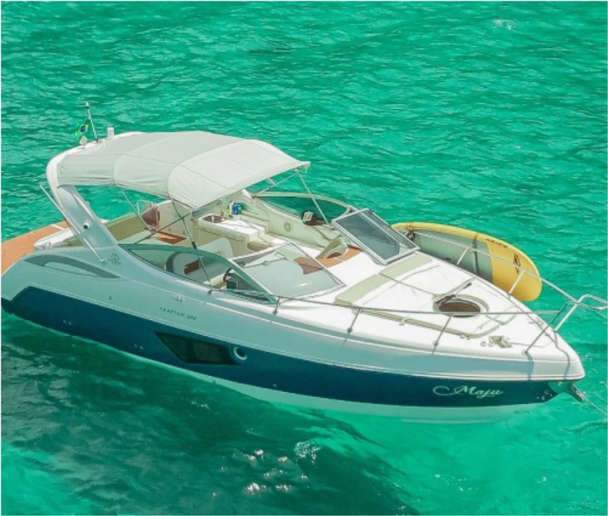 Embarcação compartilhada em 4 cotas! A Phantom 303 está ancorada na Marina Capital em Bertioga com apenas 650 horas. - Motorização: 2 motores Mercruiser 170hp, consumo de 15L/h, motor a diesel, painel bússola, GPS, rádio VHF e sistema de som. - Instalações: 1 cabine com cama de proa e cama meia nau, banheiro fechado com cabine, solarium de proa e popa, pia e geladeira externa e porta copos.