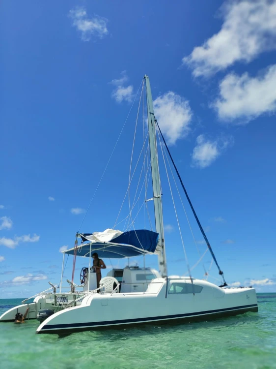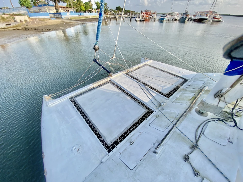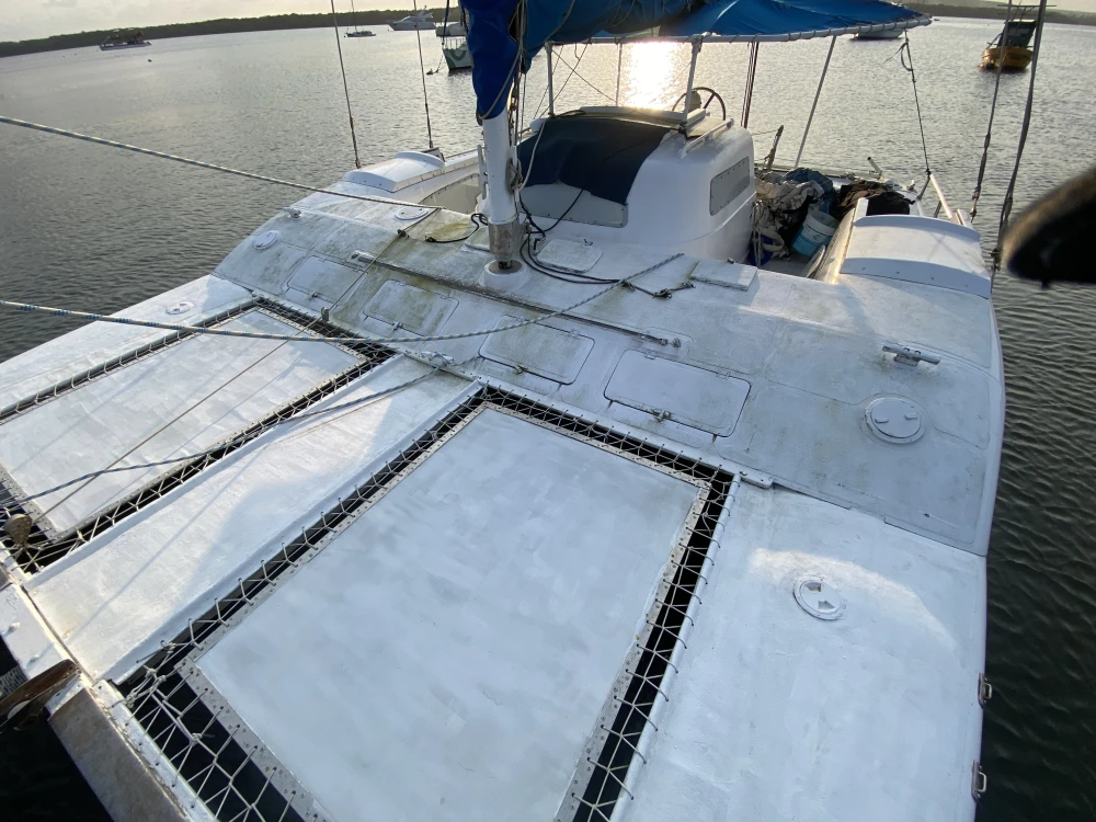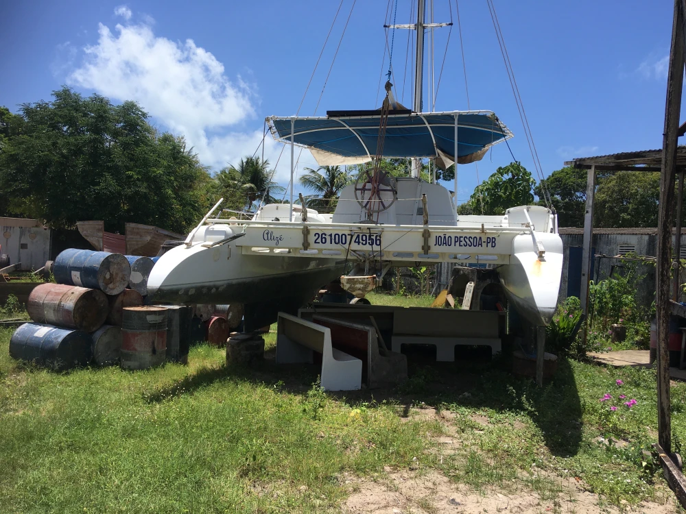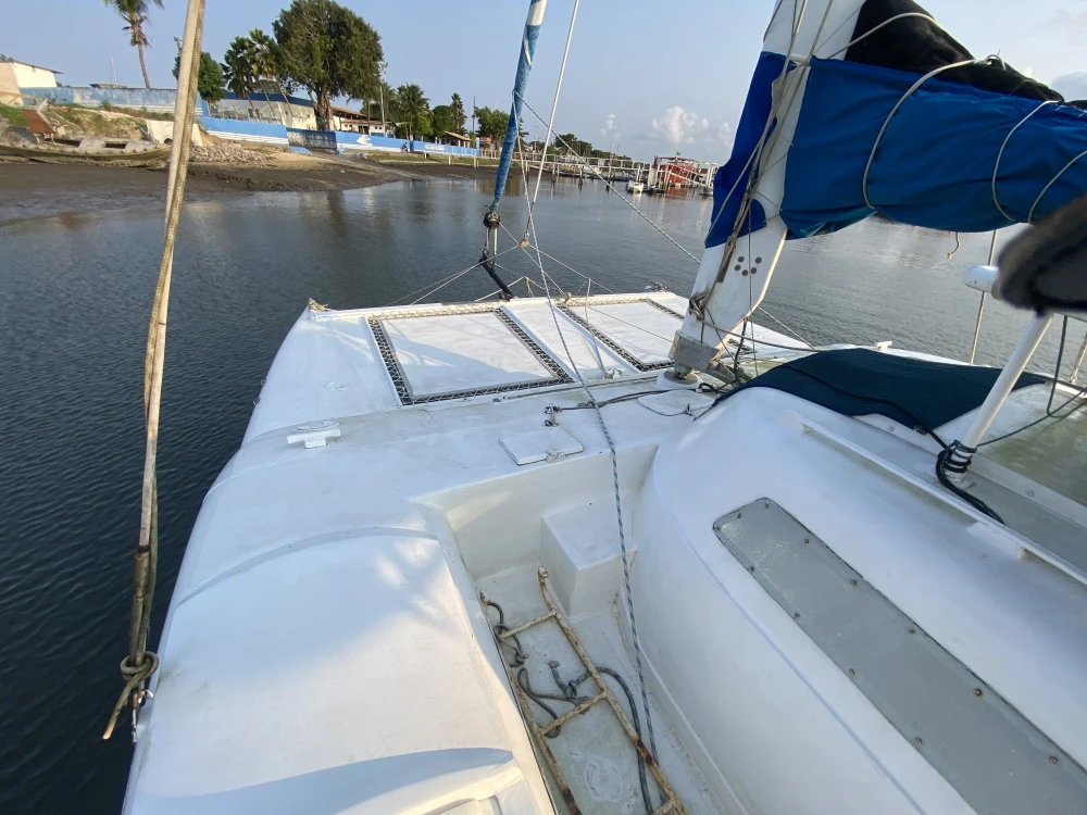 Veleiro Catamaran Modelo: Praia 28 Ano: 1991 Comprimento: 8,80 m largura: 4,92 m calado: 0,60 m capacidade: 11 pessoas construção: em fibra de vidro estaleiro: Maramar no Maranhão Motor: de popa Yamaha 15 HP velas: duas mestras e uma genoa duas defensas, boia salva-vidas, rádio, placa solar de 80 watts, bateria de 70 A, âncora Bruce, duas bomba de Porão, coletes salva-vidas, Não possui eletrônicos. Catamaran construído com a concepção “day sailer” Não vindo portanto com cozinha e banheiro instalados, é possível instalar na parte central dos cascos. Os cascos são gêmeos, em cada casco há: duas camas de solteiro, uma a vante e outra a ré, a parte central tem pé-direito de 1,50m e boca de 0,85m. Possui oito compartimentos estanques quatro em cada cascos: um avante, uma ré e o embaixo de cada cama, tornando o barco insubmersível. Existe uma cabine central medindo 2m por 2m, serve de sala e uma cama de casal. Há 11 paióis no barco: um embaixo de cada cama de solteiro, três na cabine central e quatro no convés da proa. Há dois tanque de água de 100l cada. Precisa revisar estriamento e capotaria.