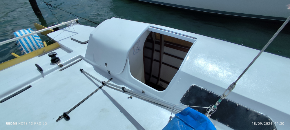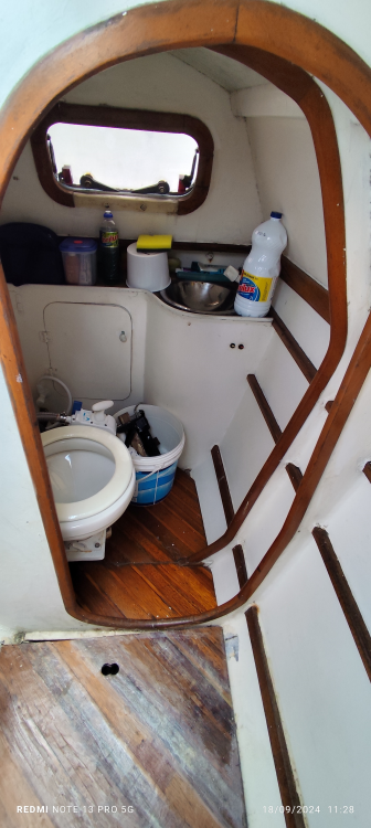 OFFICE BOAT VENDE: Catamarã Bora Bora 28 – ano de fabricação 2000 28 pés – 8,50m Comprimento da linha dágua 8,00m 0,55 m de calado. Com leme abaixado 1,10m Boca máxima 4,95m (largura) Deslocamento (equivale ao peso) 2.000kg Altura do mastro acima da linha dágua 12,00m Beliches: 4 simples. Pé direito 1,30 e cada casco. Casco de BB banheiro e vaso. Casco BE cozinha. 2 Bombas de pressurização para banheiro e cozinha Uma bateria 50A 12V Placa solar 20A com controlador de carga. Piloto automático Raymarine ST 1000 Motor Mariner americano 15hp ano 2003 2T gasolina Tanque de combustível 25 l. e alternativo de 12 l. Iluminação de led em ambos os cascos. Mastreação de tope.. Enrolador de genoa. Genoa e vela grande com duas forras de rizes. 2 catracas para escotas Uma catraca no pé do mastro. Bimini. 1 âncora bruce, de 10kg Tanques de água doce com 50l divididos entre os dois cascos. Vaso sanitário hidráulico manual. Rádio VHF marítimo. Bússola. Fogão de 1 boca PORTÁTIL. Caixa de gelo 40 l. Bomba de porão elétrica Escada inox para acesso ao mar. Material de salvatagem correspondente navegação interior 2. Conjunto de Salva-vidas. Extintor 2Kg Escada inox de acesso. Classificado como interior 2.
