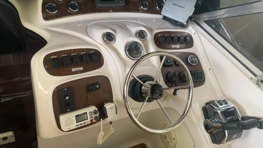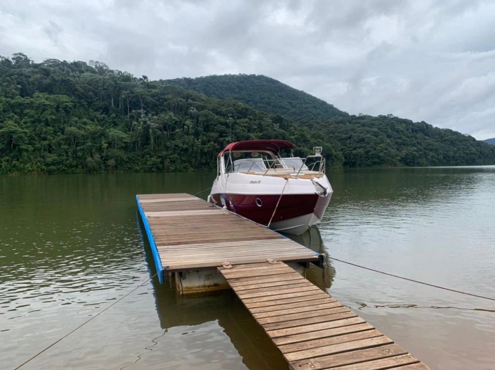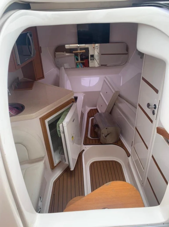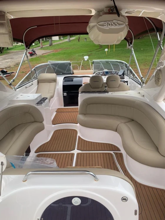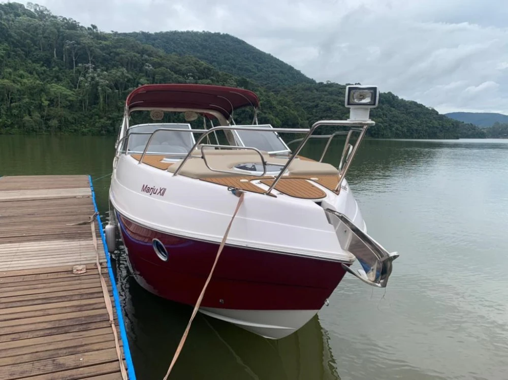 CORAL 310 FULL ANO 2014 Equipada com 2 x Mercruiser QSD 150 hp DIESEL, rabetas BRAVO 3, Carreta de encalhe, Rádio VHF, Chuveiro de popa, Cristaleira, Farol de busca, GPS com sonar, Guincho elétrico, Inversor, Flaps hidráulicos, Kit som, Solário de proa, Toldo de proteção, Microondas, Geladeira.