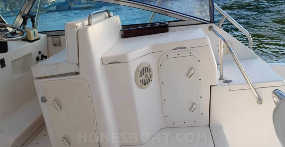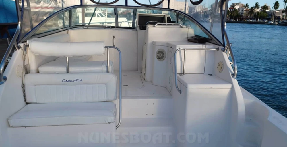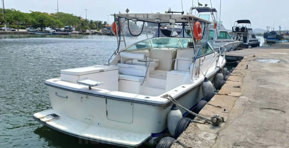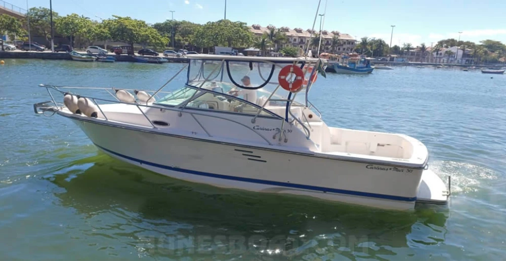 CÓD 4730 CARBRASMAR 30: 2006, 2 x mb 366 megatech 400hp, diesel, 1300hs de uso, pé de galinha, âncora bruce 10kg c/cabo, bateria, bomba de água doce, bomba de porão, bússola, capota, carreta de encalhe, churrasqueira e mesa, chuveiro de popa, coletes, comando de popa para pesca, (4) defensas, elevador de assoalho com acesso aos motores, extintor, farol, garateia de popa c/cabo, outriggers, (4) porta caniço, sanitário elétrico... F/c. Nunes (13)99706-0395