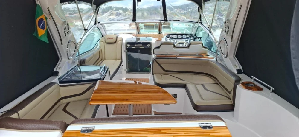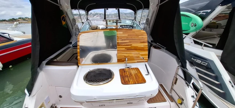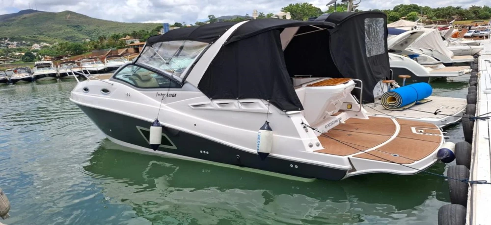 Parelha Mercruiser 4.3 220Hp Cada Motor Rabeta Bravo Âncora Eletronica Carreta Rodo Encalhe Piso Teka eva Churrasqueira embutida GPS Guincho elétrico Âncora de 15Kg Frigobar Tomada de cais Carregador de bateria Gerador Flap Baterias 04 Capa de Proteção Espaço Gourmet Cama de Proa Motor Bombordo 740 horas Motor Boreste 725 horas