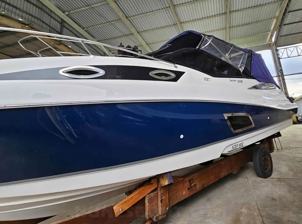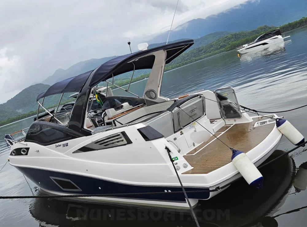 CÓD 5020 FOCKER 310 GT: 2010, mercruiser 8.1 375hp (big block blindado), gasolina, 298hs de uso, 25 top e 45 cruzeiro, rabeta bravo 3, âncora, ar condicionado webasto, (3) baterias 150amp, blower exaustor automático gás, bomba de água doce, (2) bombas de porão, bússola, buzina, capota c/fechamento total, carreta de encalhe, churrasqueira, chuveiro de popa, (12) coletes, direção hidráulica, extintor, farol robotizado, flap hidráulico, fogão indução, gps c/plotter, guincho elétrico, homologada para 12 pessoas, inversor 3000w, luzes de cortesia, luzes subaquática azul, microondas, rádio vhf, sanitário elétrico, som c/bluetooth e 6 caixas de som, strobolight, teka eva, tv samsung... F/c. Nunes (13)99706-0395