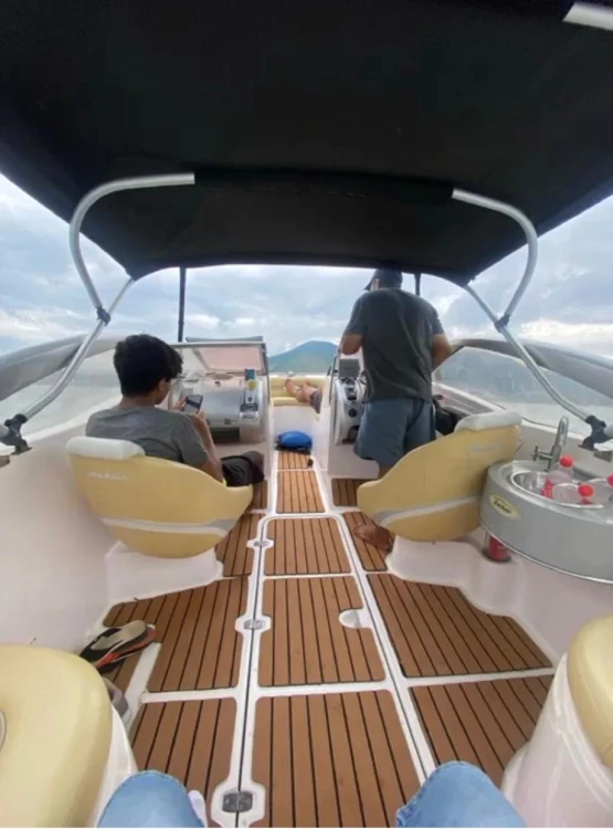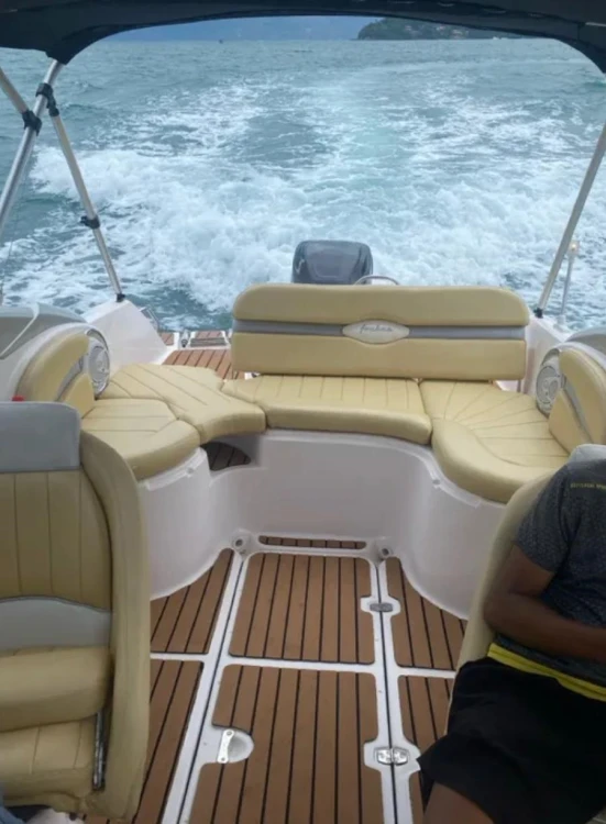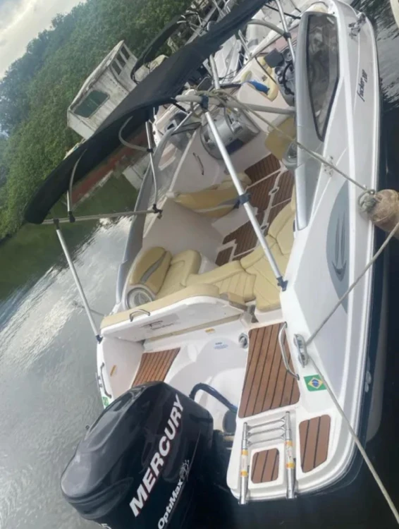 Características: Capacidade para 1 tripulante e 7 passageiros Boca de 2,32 m Calado máximo de 0,32 m Tanque de combustível de 100 L Tanque de água de 28 L Potência motor 135 hp Mercury Equipamentos: Banco do piloto giratório e regulável Banco do acompanhante giratório Caixa térmica Chuveiro na popa Compartimento para esqui no cockpit Cunhos de aço inox Encosto do banco de popa conversível em solário Escada de popa de aço inox Luzes de bordos Som a Bordo Olhal (alça) para reboque na proa