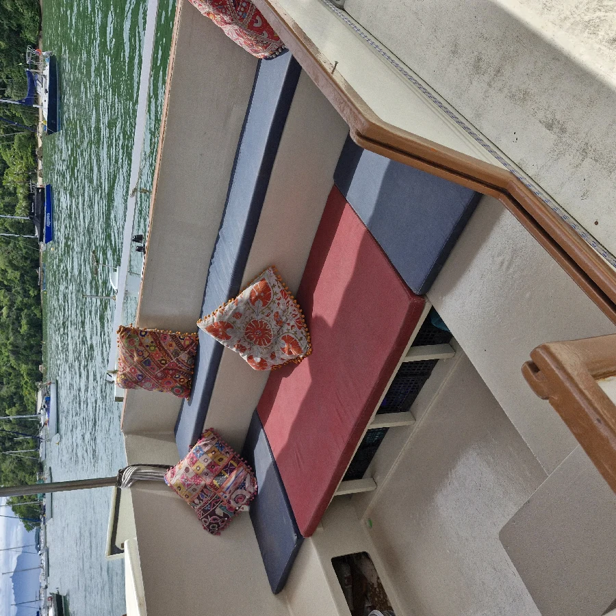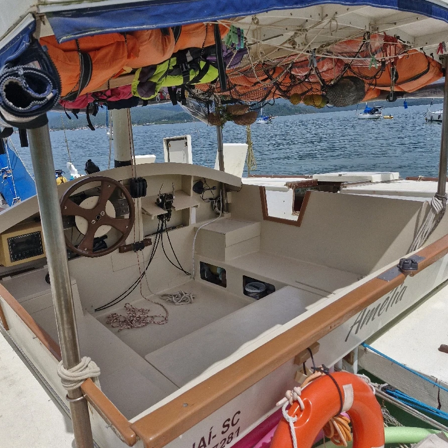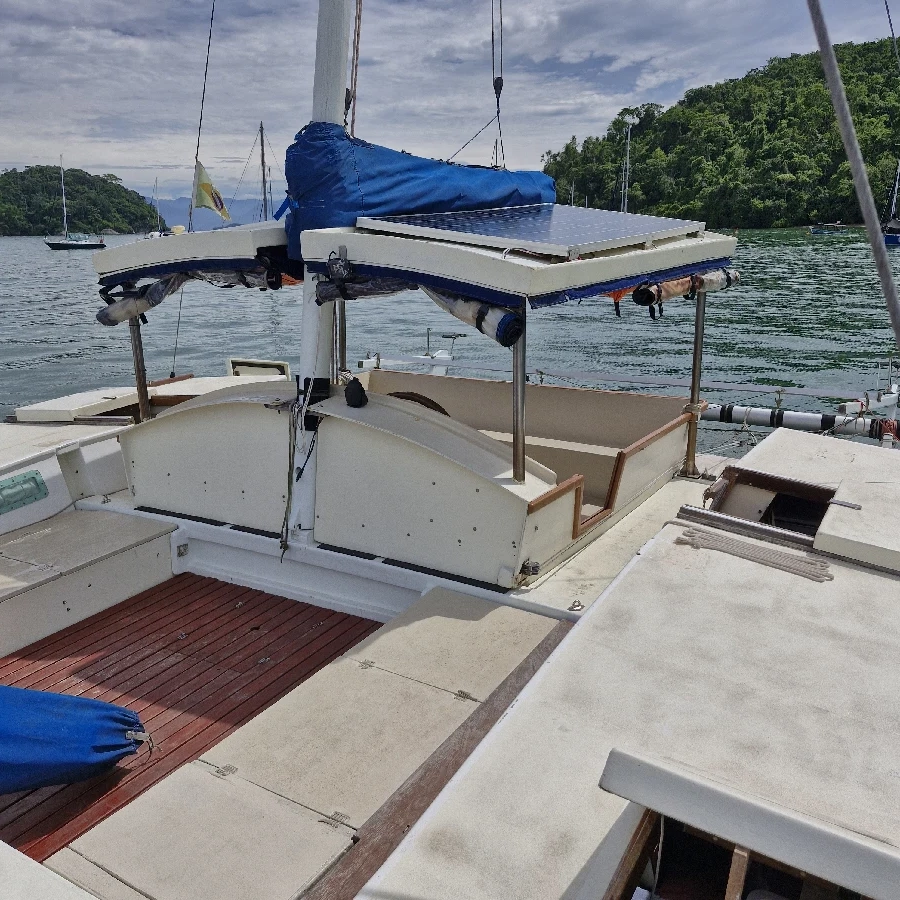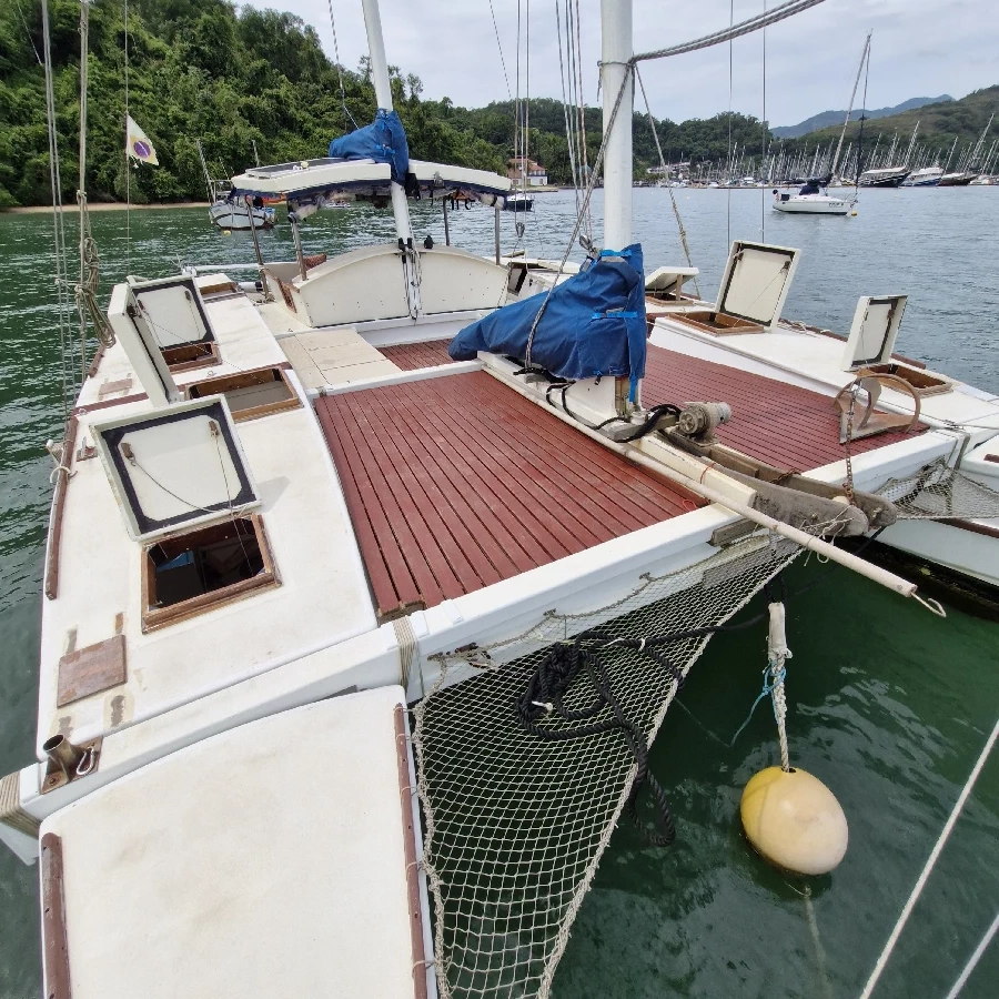 Veleiro Catamarã Tiki 38 James Wharram, em Paraty- RJ Internacionalmente reconhecido como marinheiro e guerreiro em qualquer tipo de mar. 11,6 m de comprimento e 6,2m de boca Construído em compensado naval e resina epóxi de alta qualidade, para uso particular. Muito conforto e segurança. Lotação no documento da Marinha 17 passageiros + 1 Navegação em águas abrigadas 13 passageiros + 1 Navegação Costeira 7 passageiros + 1 Navegação Oceânica Pé direito (medidas): Cozinha Bombordo 1,95m Sala Bombordo 1,85m Cabine de Casal de Proa Bombordo 1,50m (esta cabine tem o piso elevado pois o piso está preparado para receber um tanque de Aquaponia, que não foi instalado, o piso pode ser rebaixado facilmente e o pé direito ficar 1,79m ou 1,84m, depende onde posicionar o piso) Lavatório Cabine de Solteiro de popa Boreste 1,90m Cabine de Casal Boreste 1,90m WC Cabine de Proa Boreste 1,79 (possibilidade de abaixar o piso, pé direito vai para 1,84m) Casaria 1,95m PERNOITE para até 9 pessoas: Cabine de Casal Master casco boreste Cabine de Solteiro boreste Cabine de Casal na proa bombordo Cabine de casal na sala (a sala se transforma numa cabine de casal do mesmo tamanho que a cabine master) Na Casaria dormem 2 pessoas. Cascos e decks Compensado naval de pinho canadense prensado com resina fenólica, alta qualidade. Utilização de madeiras nobres: cedro rosa, timburi, sucupira, massaranduba, ipê. Laminação com tecido de fibra de vidro e resina epóxi. Tinta PU WEG Anti-encrustante Coppercoat original. Mastreação Vela principal carangueja, vela do mastro de vante carangueja e Genoa com enrolador Alado. Velas com sacos de proteção contra sol. Catraca Lewmar 30 Moitões Nautos e Harken (R$ 60.000,00 só de moitões) Tanques de água Cada casco possui um tanque abaixo dos pisos com 155l cada. 3 Tanques de água laminados acima das pias da cozinha (60l), WC principal (20l) e pia da suíte (40l), pintados com tinta especial para tanque de água potável. Água cai por gravidade não necessitando de bombas elétricas, economizando água e energia. Bomba elétrica para levar a água do tanque principal abaixo dos pisos para esses tanques de água acima das pias. WC Vaso manual instalado. Vaso Jabsco elétrico de reserva. Bomba de porão Piso do WC laminado para maior durabilidade Tanque de dejetos de 80l com filtro de carvão, preparado para marinas no exterior. Motor 2 Motores de Popa 2T 15hp Idea 2021 Comandos a distância. Eletrônicos/ Navegação 1 Antena VHF 9db AIS Owna KP 708 (tela de 7”) 2 Placas Solares de 395W 2 Controladores de Carga de 40A 2 Baterias Freedom 240ah. Fios estaiados em todas as instalações. Biruta no mastro. Âncora e Cabos Rocna 25kg com 30m de corrente 8mm 50m de cabo torcido 3 pernas 18mm poliamida Âncora reserva Bruce 10kg com 5m de corrente de 10mm 50m de Cabo torcido 3 pernas poliéster 50m Cabo Torcido 3 pernas 25mm para Reboque 6X 12m Cabo Poliester 10mm para atracação Guincho manual Equipamentos de Segurança 12 Coletes Salva Vidas Classe II G + 55kg 2x Coletes Inflável Automático 2 coletes infantis 4X Cinto peitoral de Segurança com mosquetão de engate rápido Cozinha Bomba elétrica para levar água do tanque abaixo do piso para tanque acima da pia Geladeira 120l construída com isolamento de PU e laminação interna, Kit de geladeira com compressor a distância da Elber. Bote de apoio Modelo Candy 8, construído em compensado naval de Copaíba e Resina Epóxi de alta qualidade, capacidade para até 4 pessoas. Bote rígido muito melhor que inflável sem dúvida. Defensas 2X Defensas redondas grandes vermelhas tamanho A4 Casaria (cabine central entre os cascos) A Casaria tem fechamento completo com lona e acrílico para melhor proteção e conforto. Muita proteção em dias de chuva. Teto da casaria enorme para proteção do sol.