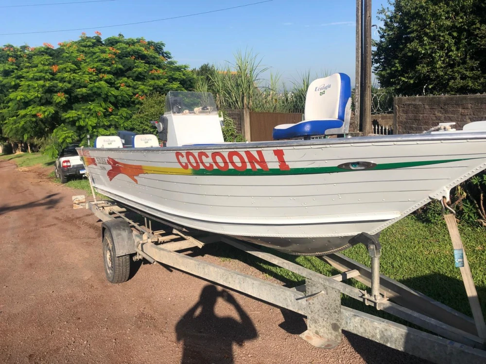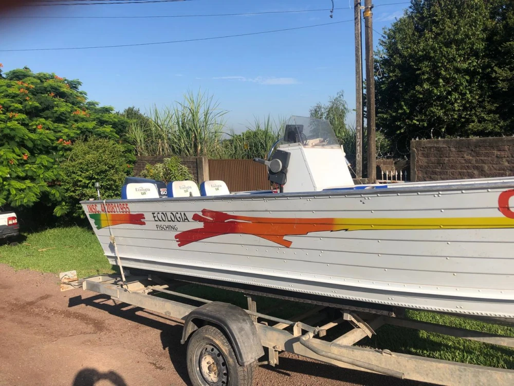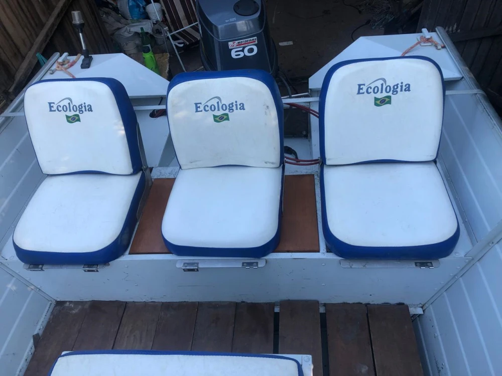 ECOLOGIA FISCHING 2012 - Barco de alumínio (19 pés/6 metros) - Borda alta (60 cm) com quebra onda nas laterais - Registrado na marinha - 06 Porta-varas - 02 Remos - Chave geral de bateria - Bomba de porão automática - Tanque de 60 litros - Viveiro - 06 Bancos estofados - 03 Alças de amarração - Luzes de navegação - Suporte de âncora - Castelo de proa - Caixa de bateria na popa - Escada - Console centralizado - 04 Portas-latão VAI JUNTO COM O BARCO: - Reboque reforçado com 4 amortecedores e molas - Barra no reboque com guia de colocação para o barco - GPS Echomap 53 DV com sonar - Âncora Danforth 5kg galvanizada - Âncora Danforth 3 kg - Âncora 3,2kg Folding dobrável - Cabo com mais de 50 metros