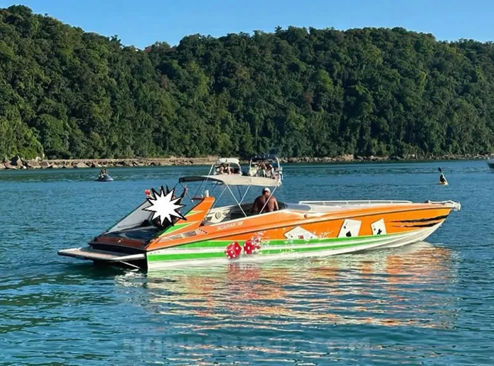 CÓD 6350 SCARAB 38: 1995, 2x mwm sprint 300hp, diesel, rabetas de superfície, 350hs de uso, 48 top e 35 cruzeiro, âncora, antena de vhf, bateria, bomba de água doce, (2) bombas de porão, bússola, buzina, capota c/fechamento total, carreta de encalhe, churrasqueira, churrasqueira, chuveiro de popa, (11) coletes, (3) defensas, direção hidráulica, (2) extintores, flap hidráulico, gps comum, guincho elétrico, rádio vhf, sanitário elétrico, som, strobolight, teca eva... F/c. Nunes (13)99706-0395