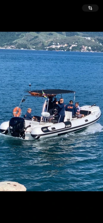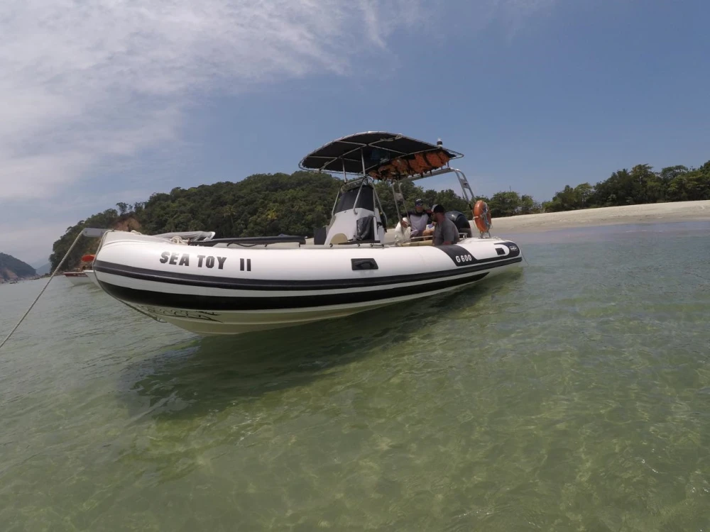 Bote inflavel , marca zefir , 6 metros de comprimento com capacidade para até 10 pessoas . Capota fixa , barco todo revestido de teca . Motor mercury 150hp ano 2022 , com 849 horas de uso . Documento de transporte de passageiro , pronto pra trabalhar em transporte de passageiro ou esporte e recreio . Completo com rádio , gps , jogo de âncora de inox com corrente girador e 80 m de cabo .