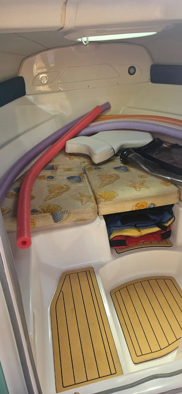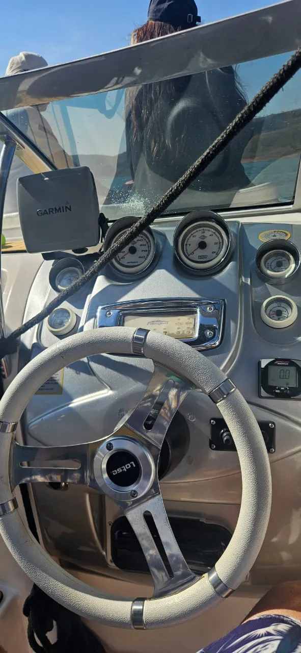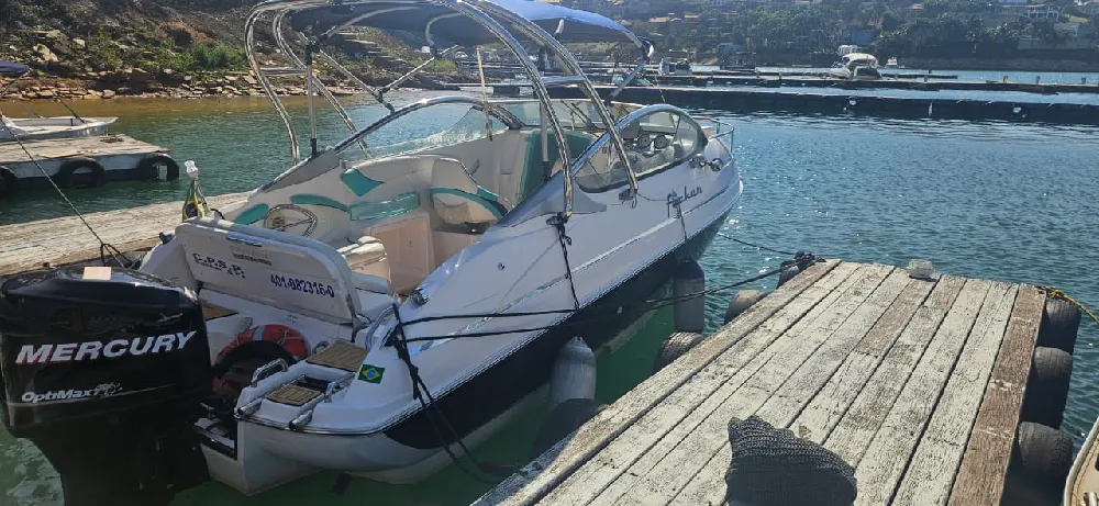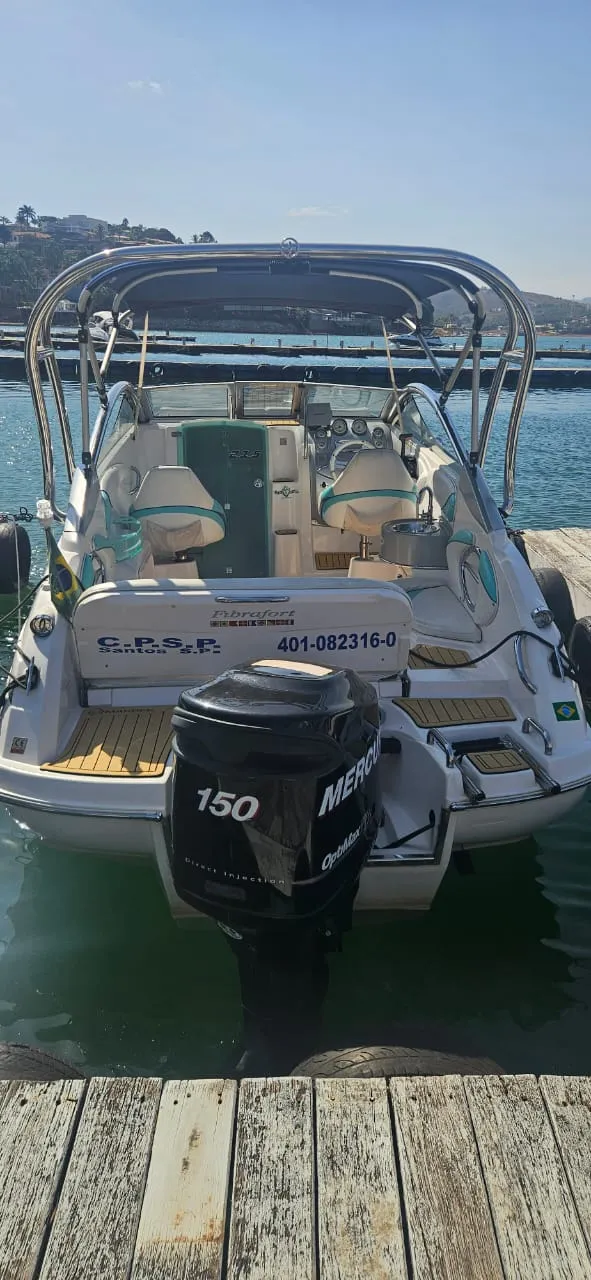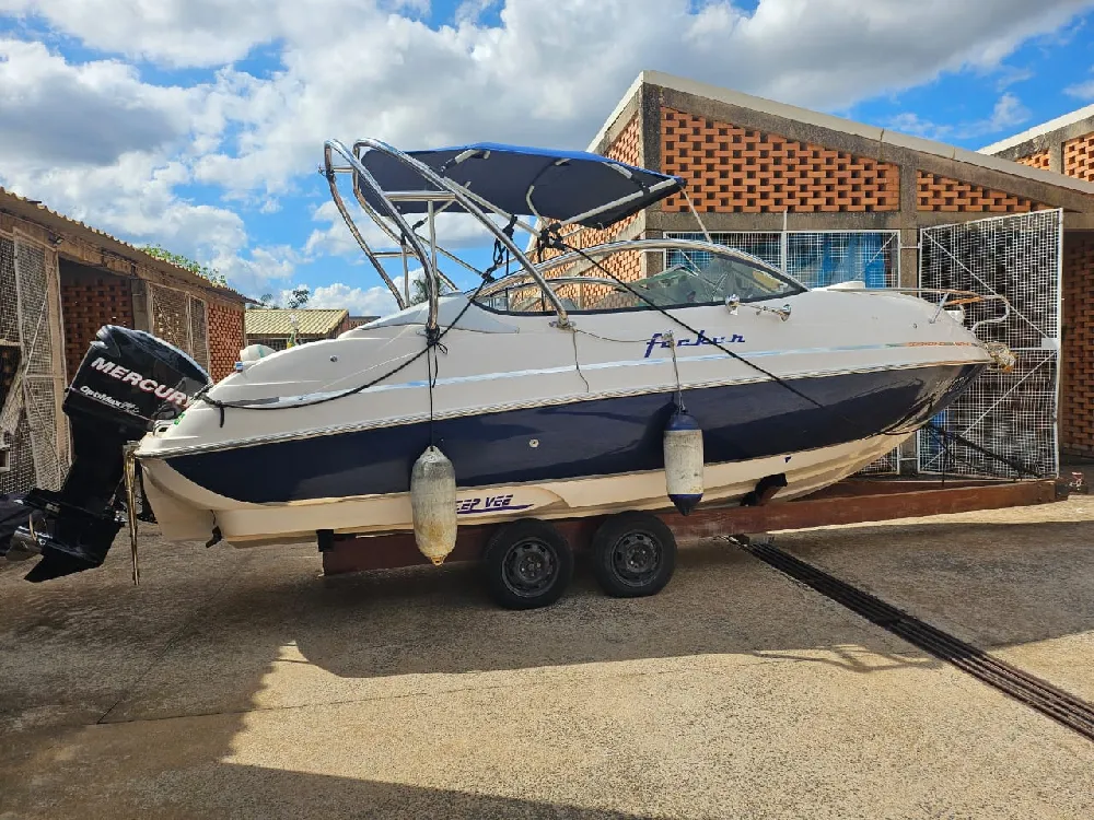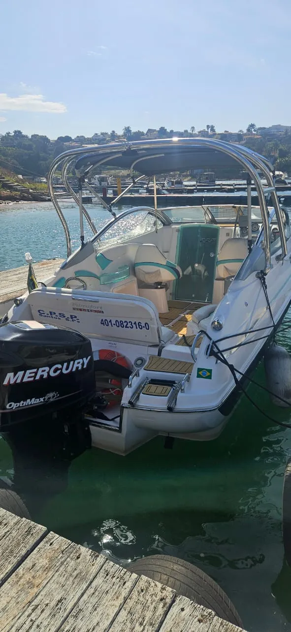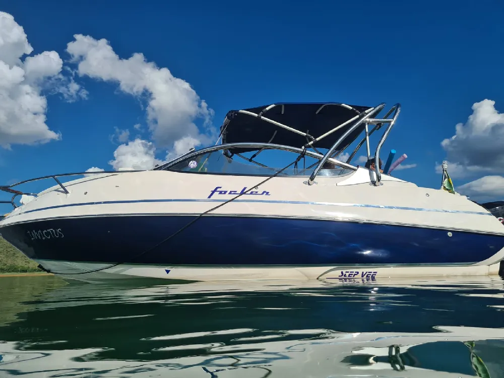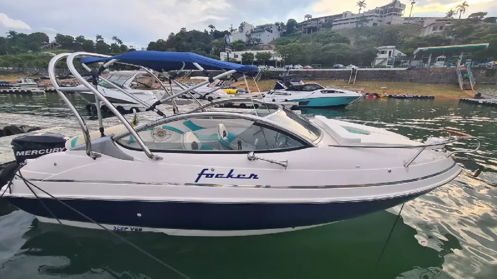 Lancha Focker 215 cabinada, ano 2007 motor Mercury 150 2T Optimax. Em excelente estado, único dono, revisões realizadas conforme manual. Carreta de encalhe em boas condições. Lona de cobertura em perfeito estado. Acessórios instalados: Farol, Gps Garmim, Som Pionner com 4 alto falantes, tapete Teka, âncora Inox, Targa Inox, almofada proa(nova) relógio digital(Indicação de nível trim, velocidade, consumo e etc), direçao hidraulica. Itens de série: Bomba de porão, 02 baterias, chave de bateria, toldo(capota), para-brisa, estofamento com tratamento anti-mofo, defensas F5(2), cordas de amarração(grandes), pia, sistema de agua doce (tanque de 40lts)