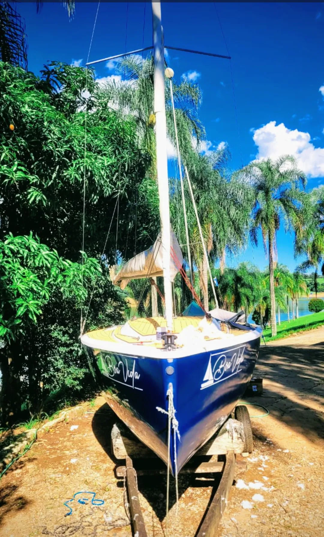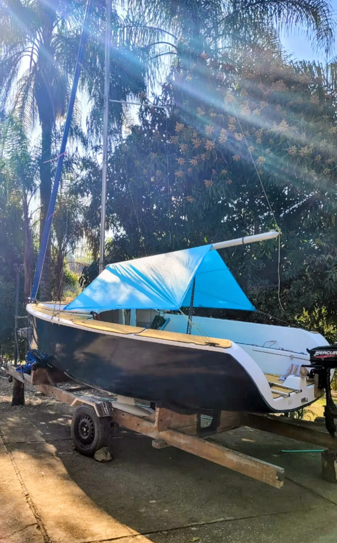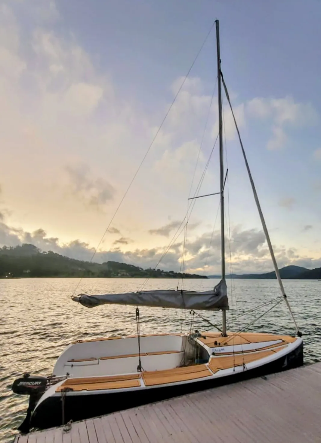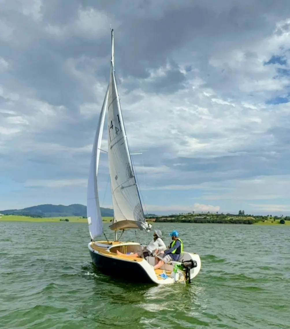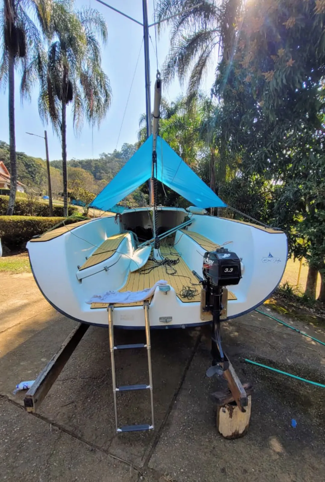 Barco em excelente estado. 2 velas grandes, 2 brujas, 1 Square top. Enrolador de Genoa, lazzy Jack, escada inox. Carreta de encalhe reformada Motor de popa 3.3 Mercury Teca de Eva convés e cockpit.