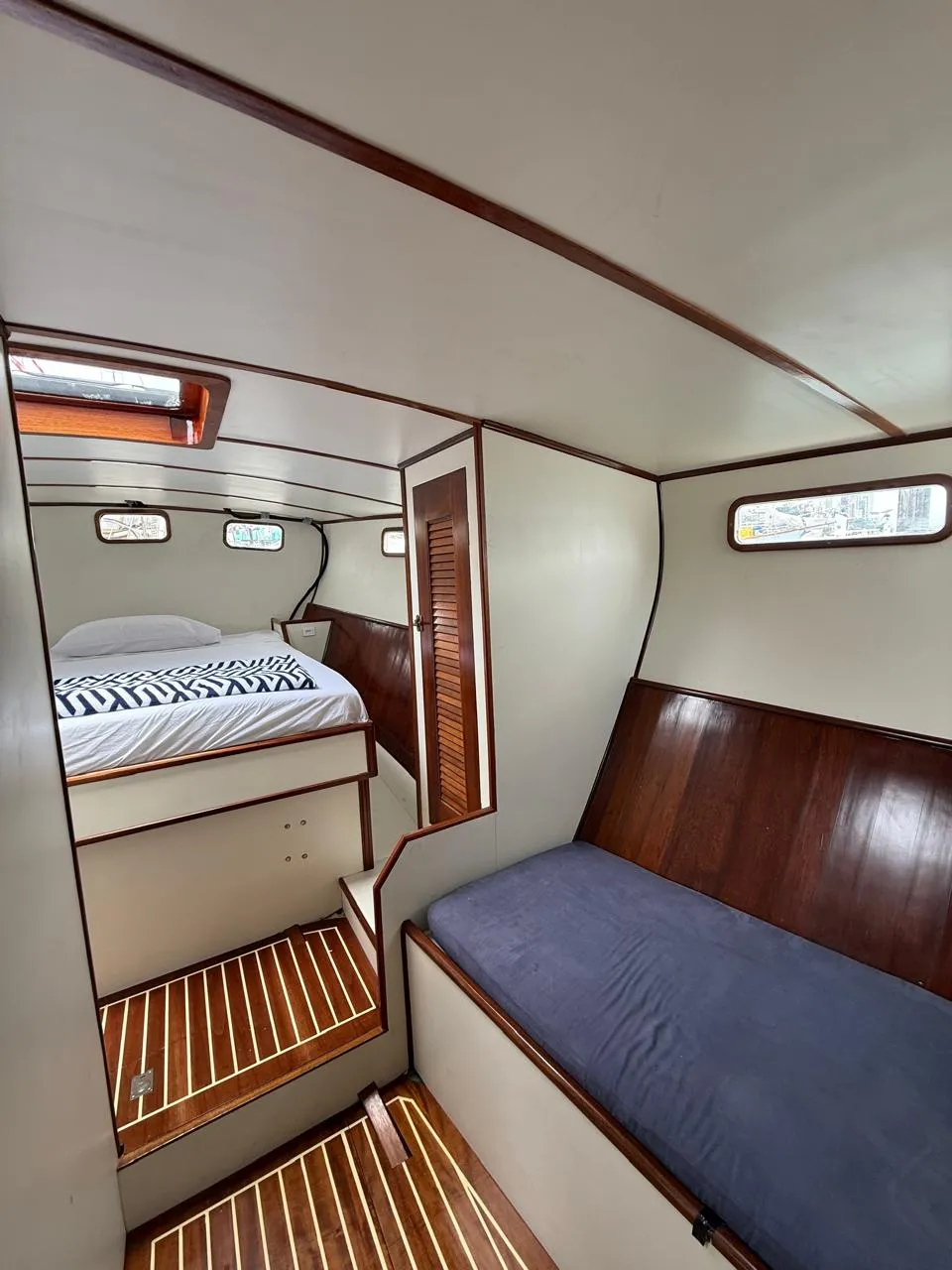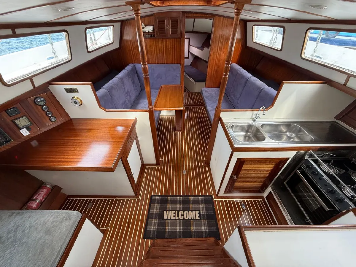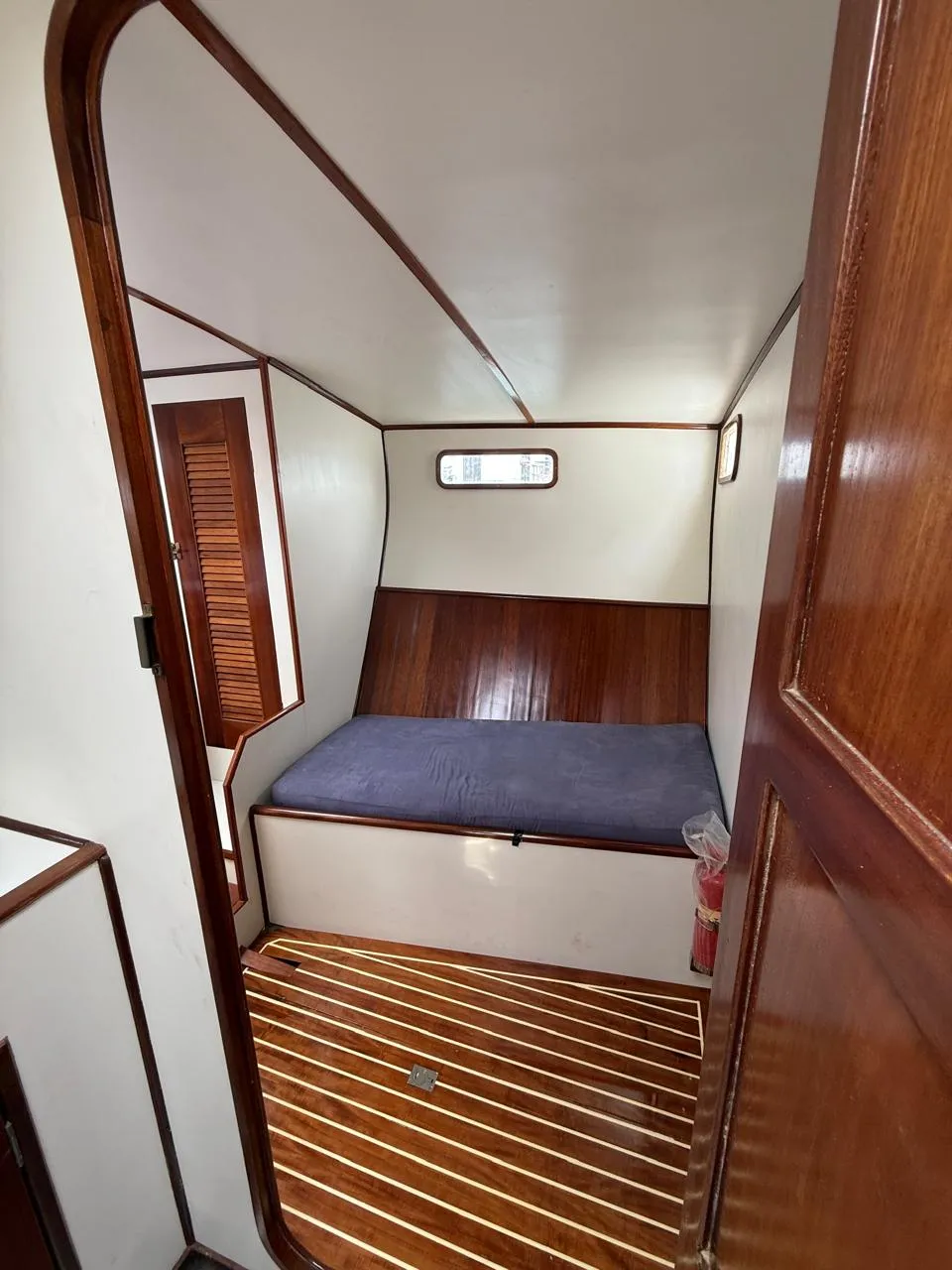 Projeto: E. Haag & Sons Estaleiro: Whangarei New Zealand Bandeira Nacional Design Nº116 Material do Casco: Aço Ano de Fabricação: 1986 Lançamento em 15.11.1986 Comprimento: 14,80 Boca: 4,26 Calado 2.16m Quilha fixa de 1,20m e 6 toneladas *MOTORIZAÇÃO* Motor Volvo Penta D2-75F 4 cilindros 75HP Consumo médio 10 l/h 100hs de navegação Motor instalado em 2018 Revisado Fev/2023. Tanque de combustível: 900 litros (inspecionado e limpo em Mar/2023) *VELARIA / MASTREAÇÃO* Genoa Mestra Mezzena Revisão completa de estaiamento e mastreação (Jul/2023) *ELETRÔNICOS / EQUIPAMENTOS* GPS Garmin ECHOMAP UHD 94sv Piloto Automático Garmin GHC 20 Radar Furuno SSB retirado (seguem em reserva no barco) Bússola de Leme Rádio SSB ICOM IC-M710 NZ Rádio VHF ICOM Portátil Radio VHF & AIS Simrad RS-40-B *ELÉTRICA* Inversor Victron Phoenix Inverter Smart Painel solar 610 / Inversor Victron MPPT 150 / 60 Carregador de Bateria Centaur 12V / 40amp Luzes de top, convés, e internas de led Revisão elétrica Jun/2023 *HIDRÁULICA* 02 Tanques de água em inox – Capacidade total de 700 litros Aquecedor de Água a gás Vaso sanitário elétrico no camarote de popa (novo) Vaso sanitário manual na proa (novo) Pia da cozinha com 2 torneiras *ANCORAGEM / FUNDEIO* Guincho de âncora elétrico, com controle de pé na proa. Âncora 30kg, com 60m de corrente galvanizada (nova) Âncora reserva 10kg, com 35m de cabo; Âncora flutuante *SALVATAGEM / APOIO* Bote Zodiac Blanc 2.8m com fundo rígido – Revisado em Jan/2023 Motor de Popa Yamaha 5cv – 2 tempos – Revisado em Jan/2023 *INFORMAÇÕES ADICIONAIS* Revisão geral do casco e chaparia (Mar/2023) – espessura das chapas 9mm. Pintura de costado e convés com PU (Mar/2023) Pintura de fundo, com Vinyguard e Seaforce preto da Jotun (Mar/2023) Cana de leme Reserva em aço Forno e Fogão Dometic 3 bocas Adriças e escotas novas Envernizamento e troca das molduras brancas internas Interior inteiramente novo
