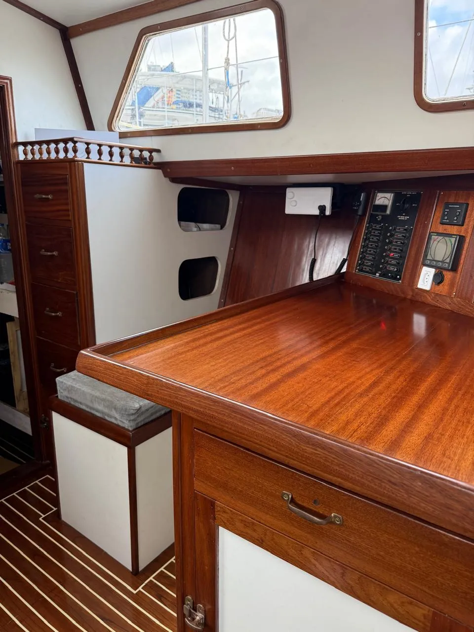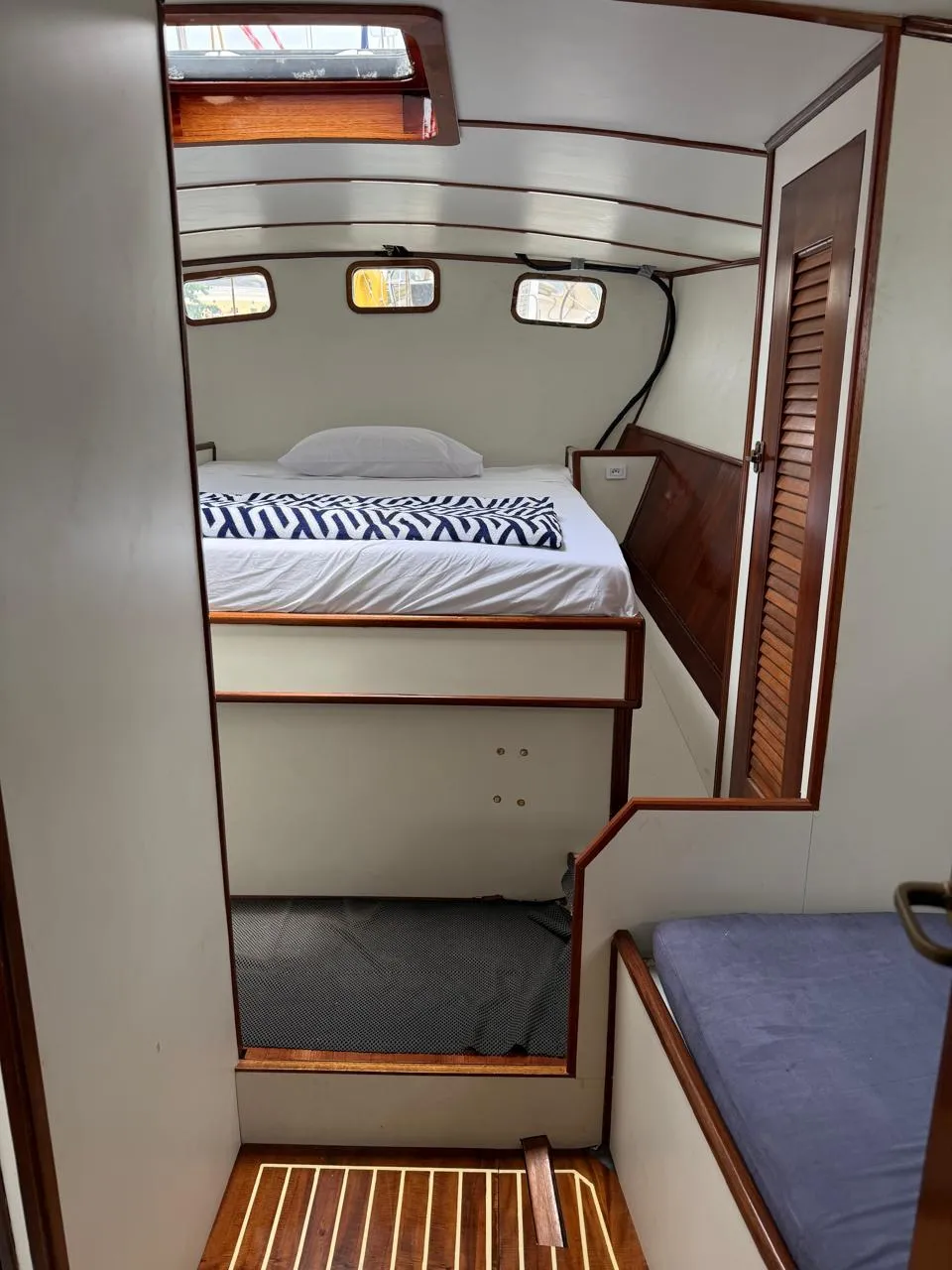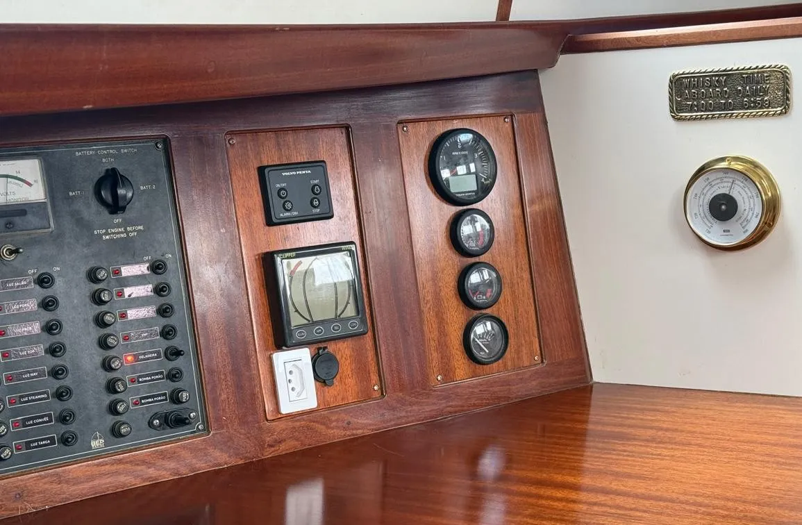 Projeto: E. Haag & Sons Estaleiro: Whangarei New Zealand Bandeira Nacional Design Nº116 Material do Casco: Aço Ano de Fabricação: 1986 Lançamento em 15.11.1986 Comprimento: 14,80 Boca: 4,26 Calado 2.16m Quilha fixa de 1,20m e 6 toneladas *MOTORIZAÇÃO* Motor Volvo Penta D2-75F 4 cilindros 75HP Consumo médio 10 l/h 100hs de navegação Motor instalado em 2018 Revisado Fev/2023. Tanque de combustível: 900 litros (inspecionado e limpo em Mar/2023) *VELARIA / MASTREAÇÃO* Genoa Mestra Mezzena Revisão completa de estaiamento e mastreação (Jul/2023) *ELETRÔNICOS / EQUIPAMENTOS* GPS Garmin ECHOMAP UHD 94sv Piloto Automático Garmin GHC 20 Radar Furuno SSB retirado (seguem em reserva no barco) Bússola de Leme Rádio SSB ICOM IC-M710 NZ Rádio VHF ICOM Portátil Radio VHF & AIS Simrad RS-40-B *ELÉTRICA* Inversor Victron Phoenix Inverter Smart Painel solar 610 / Inversor Victron MPPT 150 / 60 Carregador de Bateria Centaur 12V / 40amp Luzes de top, convés, e internas de led Revisão elétrica Jun/2023 *HIDRÁULICA* 02 Tanques de água em inox – Capacidade total de 700 litros Aquecedor de Água a gás Vaso sanitário elétrico no camarote de popa (novo) Vaso sanitário manual na proa (novo) Pia da cozinha com 2 torneiras *ANCORAGEM / FUNDEIO* Guincho de âncora elétrico, com controle de pé na proa. Âncora 30kg, com 60m de corrente galvanizada (nova) Âncora reserva 10kg, com 35m de cabo; Âncora flutuante *SALVATAGEM / APOIO* Bote Zodiac Blanc 2.8m com fundo rígido – Revisado em Jan/2023 Motor de Popa Yamaha 5cv – 2 tempos – Revisado em Jan/2023 *INFORMAÇÕES ADICIONAIS* Revisão geral do casco e chaparia (Mar/2023) – espessura das chapas 9mm. Pintura de costado e convés com PU (Mar/2023) Pintura de fundo, com Vinyguard e Seaforce preto da Jotun (Mar/2023) Cana de leme Reserva em aço Forno e Fogão Dometic 3 bocas Adriças e escotas novas Envernizamento e troca das molduras brancas internas Interior inteiramente novo