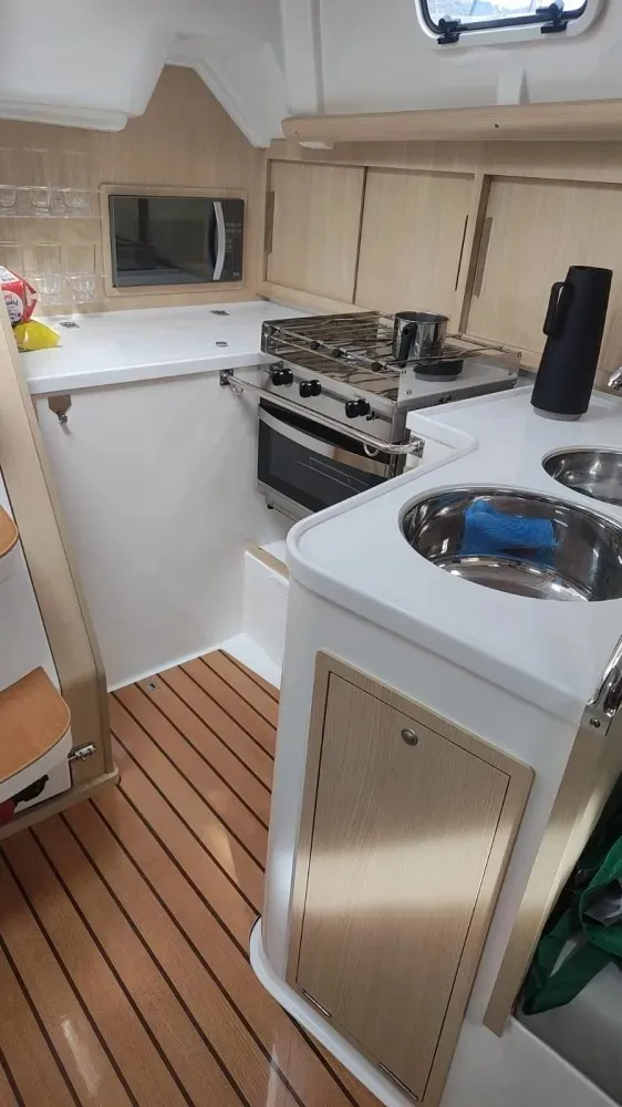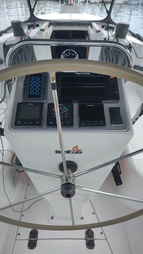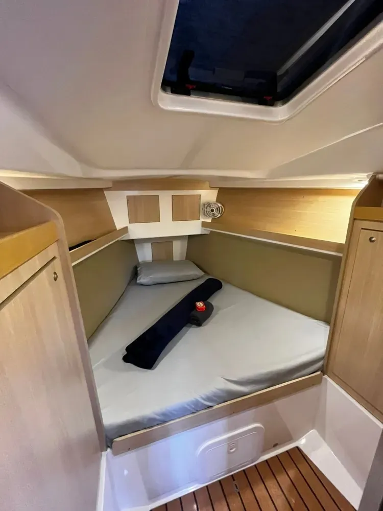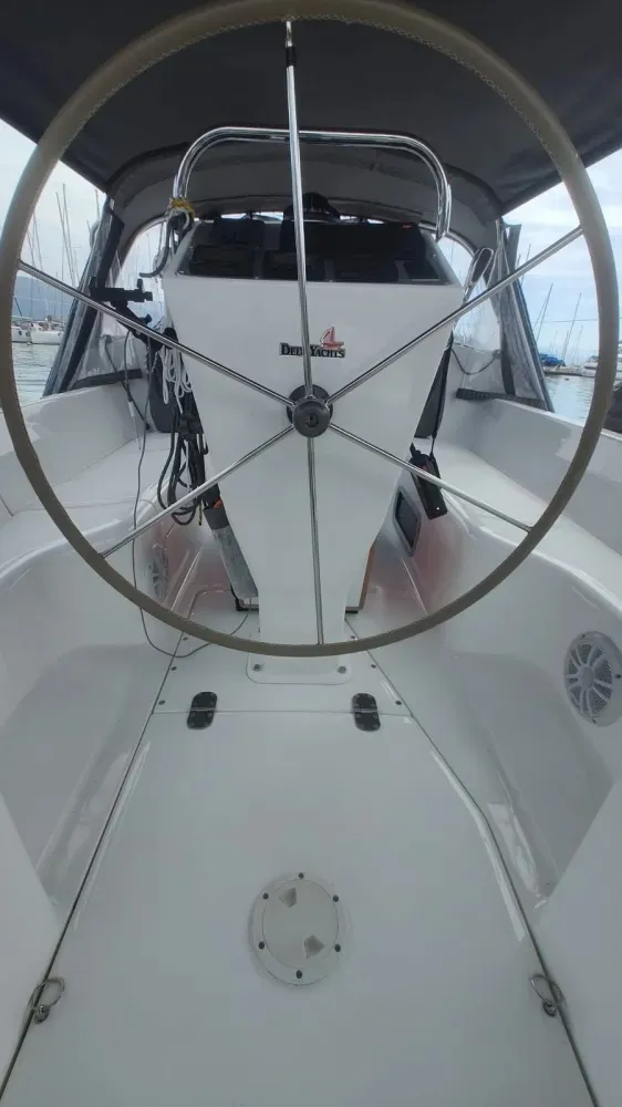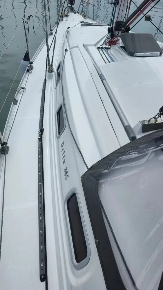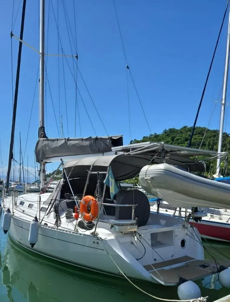 Designer: Nestor Vólker. Comprimento total: 11,00 m Boca: 3,66 m Deslocamento: 5.950 kg. ? Material Casco: Poliéster Isofitálico com fibra de vidro. Convés construído em Poliéster com núcleo em espuma de PVC Leme de fibra de vidro com resina epóxi. ? Quilha semi-elíptica com bulbo de ferro de 2.670 kg. ? *MOTORIZAÇÃO* Motor: Volvo Penta Modelo D130S 30 HP. Tanque de diesel: 150 litros em aço inox. Sistema de escapamento e isolamento acústico *VELARIA / MASTREAÇÃO* Vela mestra em Dacron com 02 rizos. Vela Genoa Pau de Spi Enrolador de genoa Battencar Burro rígido de mola Mastro de alumínio, seção de 200 mm. Estaiamento: cabo de aço inox 1 x 19 com esticadores Holt Nautos. 02 catracas 48 02 catracas 40 01 catraca elétrica *ELETRÔNICOS* Chartplotter Raymarine Piloto automático Raymarine Estação de vento Raymarine Rádio VHF Raymarine Rádio AM/FM Tridata Raymarine Controle de ar-condicionado MarinAire *ELÉTRICA* 03 baterias de 105 AH 01 bateria de 65 AH. Placa solar Painel elétrico Arieltek P03 Inversor Technomaster TM R1 Ar-condicionado Ventiladores Luzes de led Voltímetro para 02 bancos de bateria Cabos elétricos em cobre com isolamento de estanho Sistema AC 110V com inversor de 2000W. ? Tomadas internas 110W 02 tomadas de 12 volts Shore Power *HIDRÁULICA* Armazenamento de água doce: 385 litros em 03 tanques. ? Sistema de distribuição com bomba de água pressurizada. ? 01 bomba de água pressurizada Jabsco 01 bomba elétrica no poceto 01 bomba manual Boiler 20 litros Sanitário hidráulico elétrico. *ANCORAGEM / FUNDEIO* Guincho de âncora Lewmar 1000w Âncora Bruce 15 kg 25 metros de corrente calibrada 40 metros de cabo *SALVATAGEM / APOIO* Bote de 2,40 m Motor de popa Mercury 9.9 HP Salvatagem completa para 7 pessoas *INFORMAÇÕES ADICIONAIS* Geladeira de 140 litros Fogão 02 bocas Estofados em espuma poliuretano com tratamento antifúngico. ? Sistema de som/imagem com Smart TV. ? Plataforma de popa rebatível Churrasqueira de inox Targa de inox