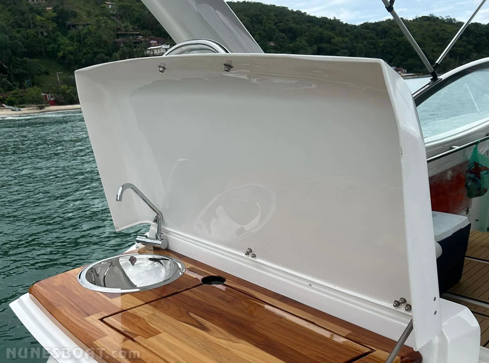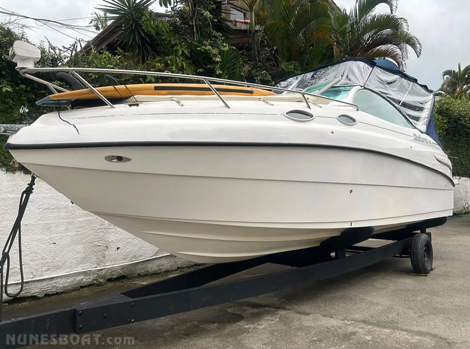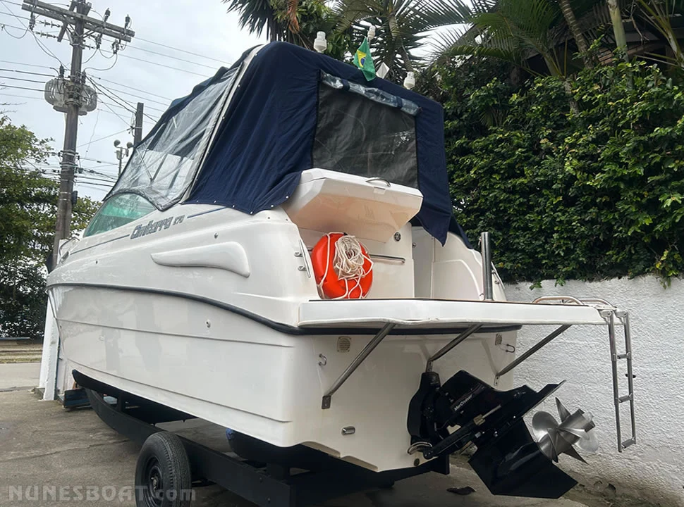 CÓD 2802 CIMITARRA 270: 2005, mercruiser 5.7 300hp ano 2010, gasolina, 290hs de uso, 40 top e 28 cruzeiro, rabeta mercruiser bravo 3, âncora, bateria, bomba de água doce, (2) bombas de porão, bússola elétrica, buzina, capota c/fechamento total, carregador de bateria, carreta de encalhe, churrasqueira, chuveiro de popa, (12) coletes, (4) defensas, direção hidráulica, farol c/controle remoto, extintores, flap hidráulico, geleira, gps c/plotter, guincho elétrico, inversor, rádio vhf, sanitário elétrico, som, teca, tv 21”, (2) ventiladores... F/c. Nunes (13)99706-0395