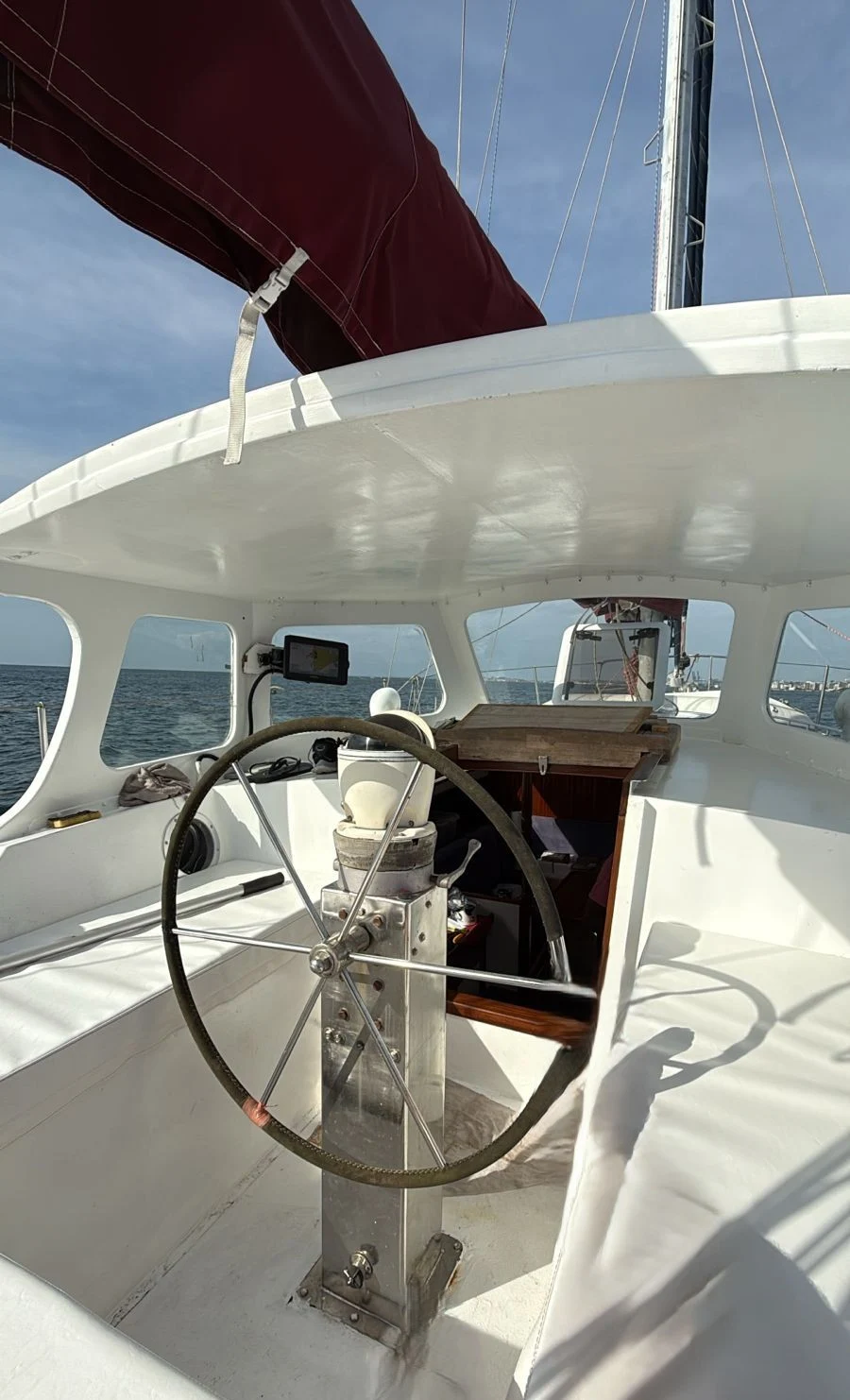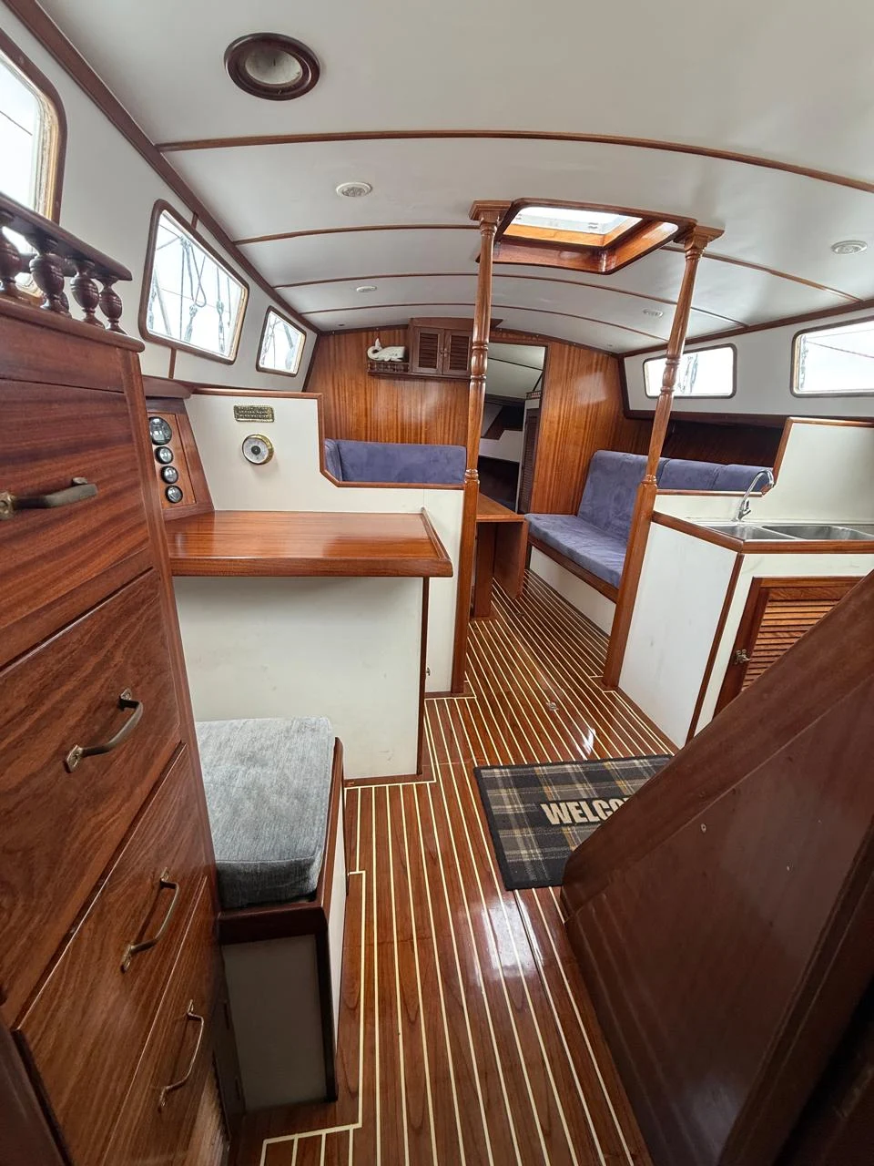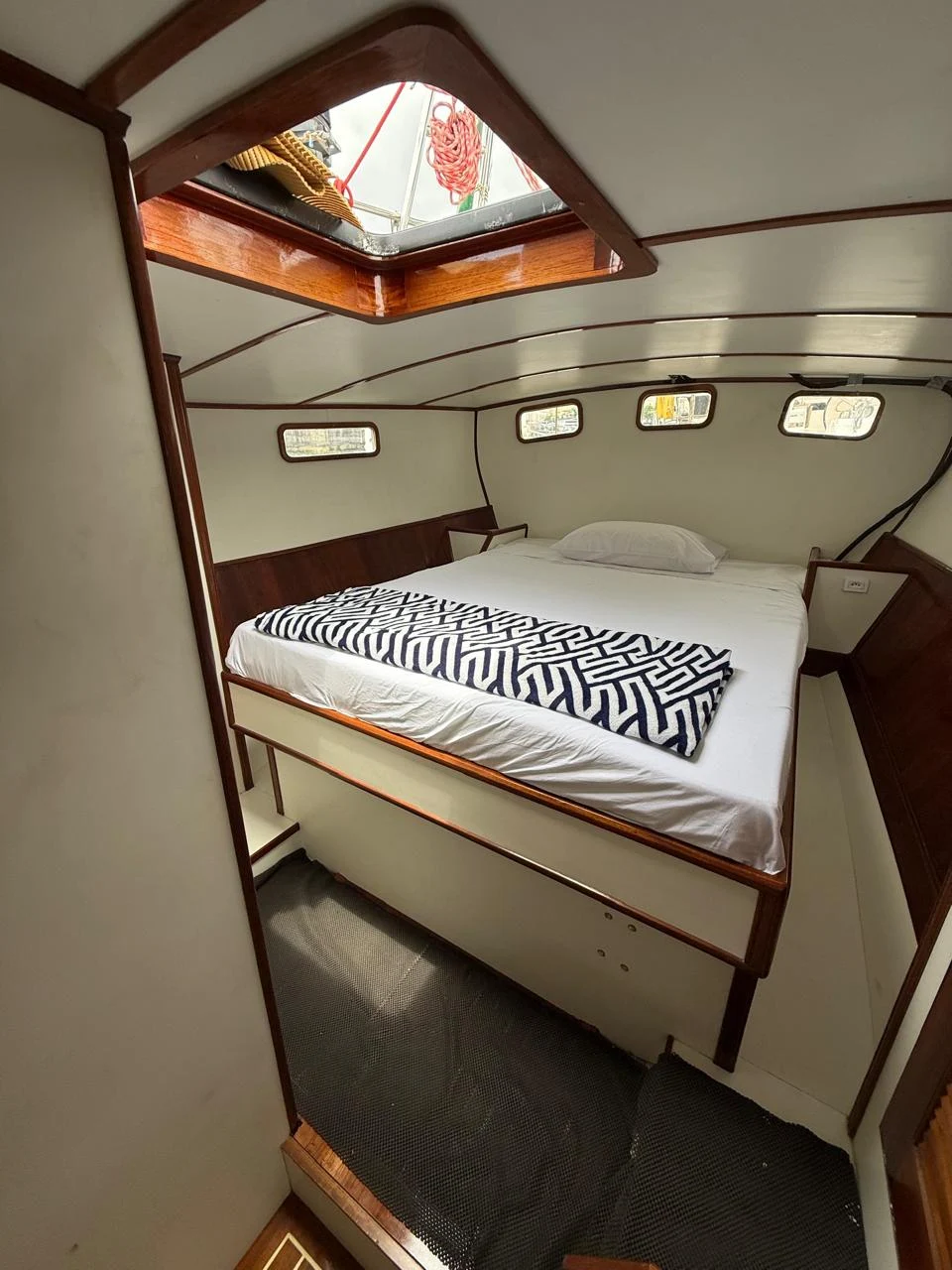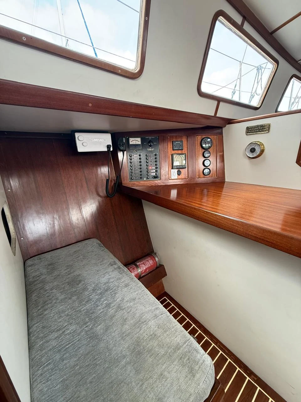 *ESPECIFICAÇÕES TÉCNICAS* Projeto: E. Haag & Sons Estaleiro: Whangarei New Zealand Bandeira Nacional Design Nº116 Material do Casco: Aço Ano de Fabricação: 1986 Lançamento em 15.11.1986 Comprimento: 14,80 Boca: 4,26 Calado 2.16m Quilha fixa de 1,20m e 6 toneladas *MOTORIZAÇÃO* Motor Volvo Penta D2-75F 4 cilindros 75HP Consumo médio 10 l/h 100hs de navegação Motor instalado em 2018 Revisado Fev/2023. Tanque de combustível: 900 litros (inspecionado e limpo em Mar/2023) *VELARIA / MASTREAÇÃO* Genoa Mestra Mezzena Revisão completa de estaiamento e mastreação (Jul/2023) *ELETRÔNICOS / EQUIPAMENTOS* GPS Garmin ECHOMAP UHD 94sv Piloto Automático Garmin GHC 20 Radar Furuno SSB retirado (seguem em reserva no barco) Bússola de Leme Rádio SSB ICOM IC-M710 NZ Rádio VHF ICOM Portátil Radio VHF & AIS Simrad RS-40-B *ELÉTRICA* Inversor Victron Phoenix Inverter Smart Painel solar 610 / Inversor Victron MPPT 150 / 60 Carregador de Bateria Centaur 12V / 40amp Luzes de top, convés, e internas de led Revisão elétrica Jun/2023 *HIDRÁULICA* 02 Tanques de água em inox – Capacidade total de 700 litros Aquecedor de Água a gás Vaso sanitário elétrico no camarote de popa (novo) Vaso sanitário manual na proa (novo) Pia da cozinha com 2 torneiras *ANCORAGEM / FUNDEIO* Guincho de âncora elétrico, com controle de pé na proa. Âncora 30kg, com 60m de corrente galvanizada (nova) Âncora reserva 10kg, com 35m de cabo; Âncora flutuante *SALVATAGEM / APOIO* Bote Zodiac Blanc 2.8m com fundo rígido – Revisado em Jan/2023 Motor de Popa Yamaha 5cv – 2 tempos – Revisado em Jan/2023 *INFORMAÇÕES ADICIONAIS* Revisão geral do casco e chaparia (Mar/2023) – espessura das chapas 9mm. Pintura de costado e convés com PU (Mar/2023) Pintura de fundo, com Vinyguard e Seaforce preto da Jotun (Mar/2023) Cana de leme Reserva em aço Forno e Fogão Dometic 3 bocas Adriças e escotas novas Envernizamento e troca das molduras brancas internas Interior inteiramente novo