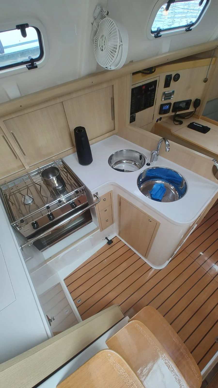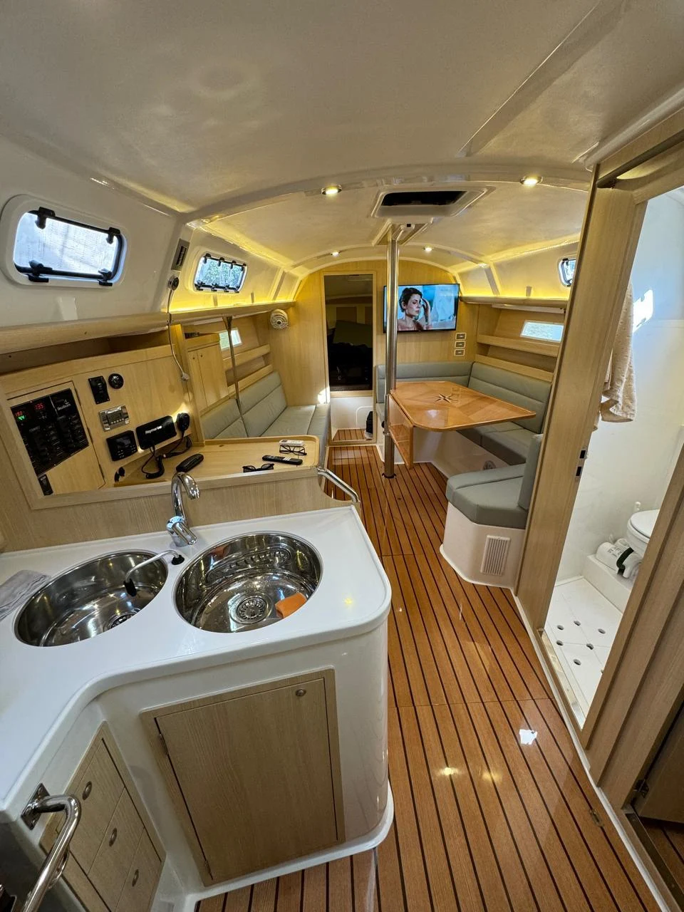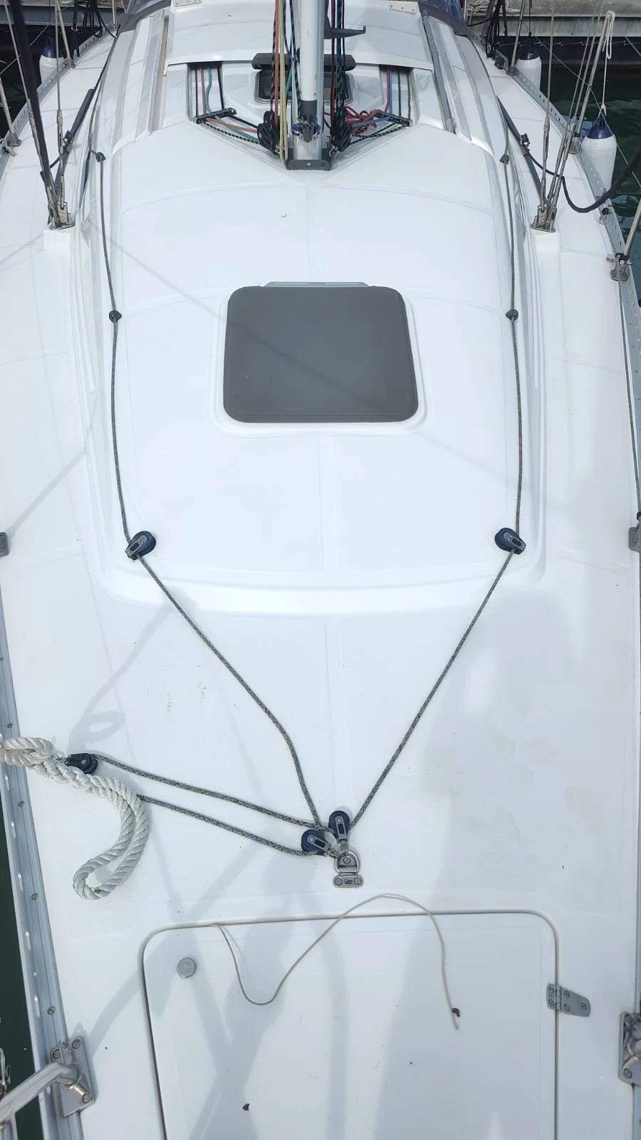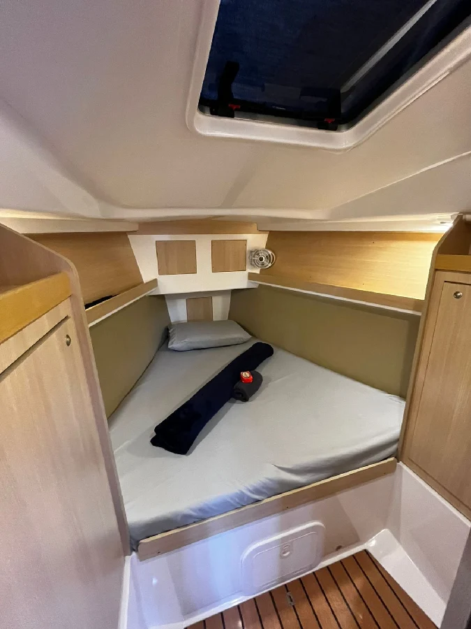 *ESPECIFICAÇÕES TÉCNICAS* Designer: Nestor Vólker. Comprimento total: 11,00 m Boca: 3,66 m Deslocamento: 5.950 kg. ? Material Casco: Poliéster Isofitálico com fibra de vidro. Convés construído em Poliéster com núcleo em espuma de PVC Leme de fibra de vidro com resina epóxi. ? Quilha semi-elíptica com bulbo de ferro de 2.670 kg. ? *MOTORIZAÇÃO* Motor: Volvo Penta Modelo D130S 30 HP. Tanque de diesel: 150 litros em aço inox. Sistema de escapamento e isolamento acústico *VELARIA / MASTREAÇÃO* Vela mestra em Dacron com 02 rizos. Vela Genoa Pau de Spi Enrolador de genoa Battencar Burro rígido de mola Mastro de alumínio, seção de 200 mm. Estaiamento: cabo de aço inox 1 x 19 com esticadores Holt Nautos. 02 catracas 48 02 catracas 40 01 catraca elétrica *ELETRÔNICOS* Chartplotter Raymarine Piloto automático Raymarine Estação de vento Raymarine Rádio VHF Raymarine Rádio AM/FM Tridata Raymarine Controle de ar-condicionado MarinAire *ELÉTRICA* 03 baterias de 105 AH 01 bateria de 65 AH. Placa solar Painel elétrico Arieltek P03 Inversor Technomaster TM R1 Ar-condicionado Ventiladores Luzes de led Voltímetro para 02 bancos de bateria Cabos elétricos em cobre com isolamento de estanho Sistema AC 110V com inversor de 2000W. ? Tomadas internas 110W 02 tomadas de 12 volts Shore Power *HIDRÁULICA* Armazenamento de água doce: 385 litros em 03 tanques. ? Sistema de distribuição com bomba de água pressurizada. ? 01 bomba de água pressurizada Jabsco 01 bomba elétrica no poceto 01 bomba manual Boiler 20 litros Sanitário hidráulico elétrico. *ANCORAGEM / FUNDEIO* Guincho de âncora Lewmar 1000w Âncora Bruce 15 kg 25 metros de corrente calibrada 40 metros de cabo *SALVATAGEM / APOIO* Bote de 2,40 m Motor de popa Mercury 9.9 HP Salvatagem completa para 7 pessoas *INFORMAÇÕES ADICIONAIS* Geladeira de 140 litros Fogão 02 bocas Estofados em espuma poliuretano com tratamento antifúngico. ? Sistema de som/imagem com Smart TV. ? Plataforma de popa rebatível Churrasqueira de inox Targa de inox