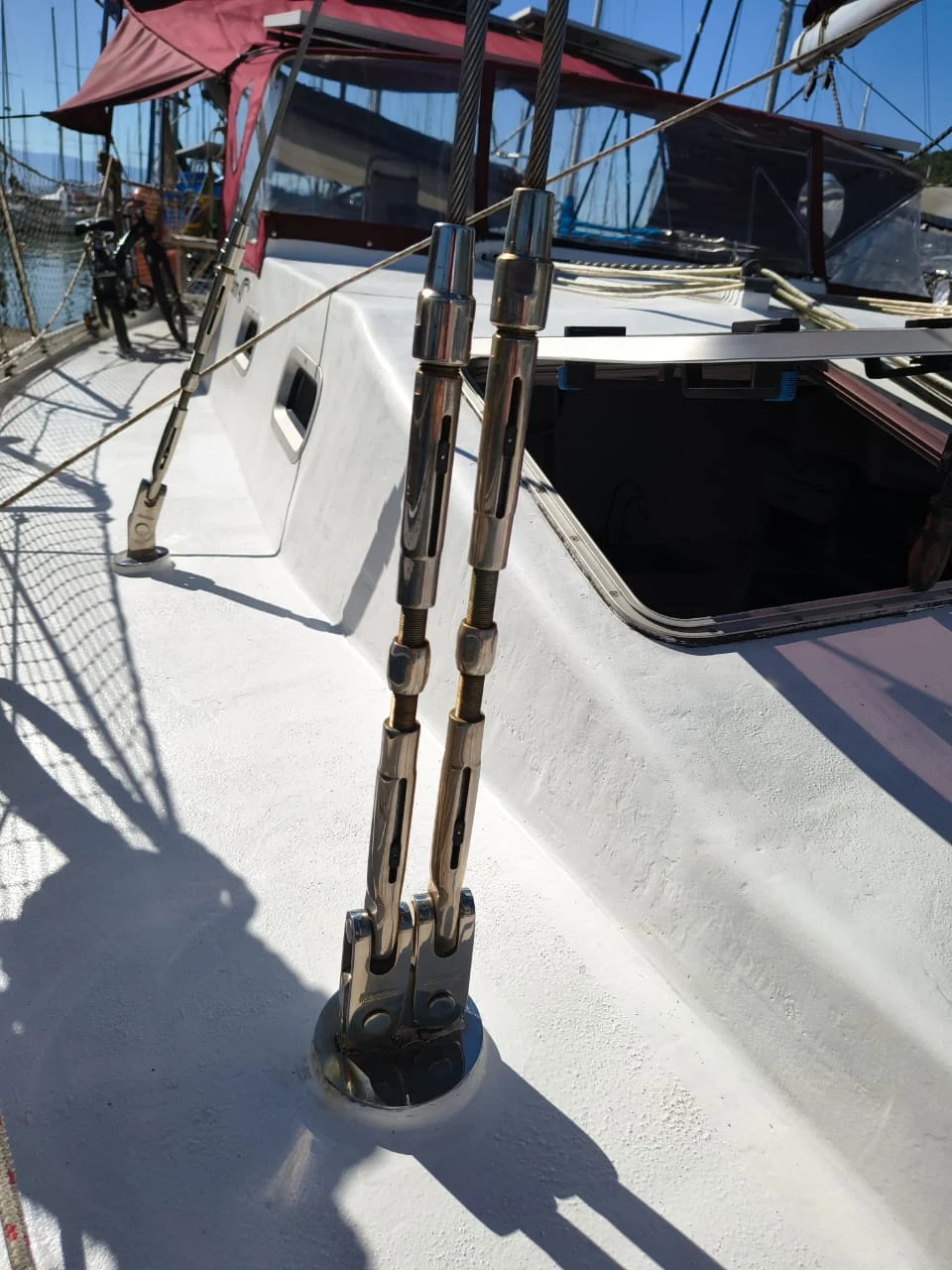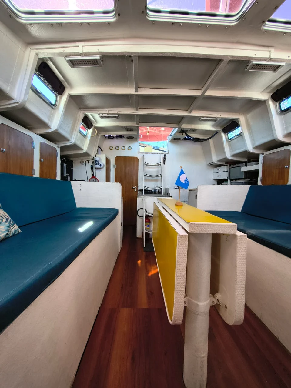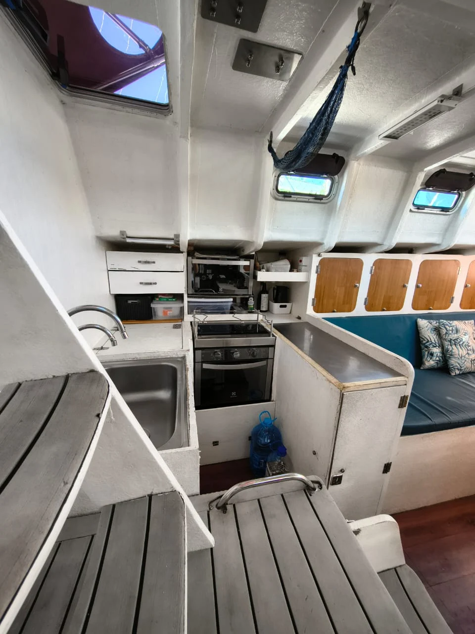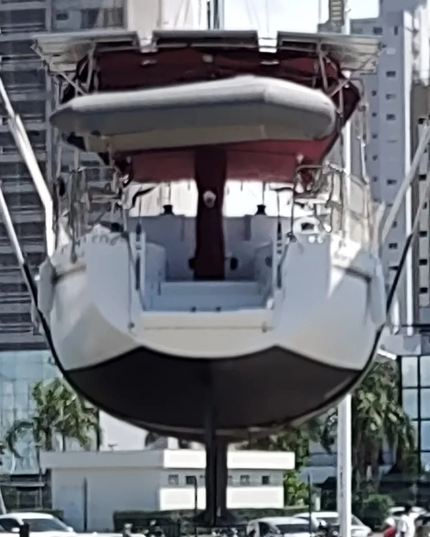 *ESPECIFICAÇÕES TÉCNICAS* Projeto Roberto Barros (Cabinho). Mar aberto – Navegação Oceânica. Construído em sanduíche de fibra de vidro (com miolo de colméia Nidacor de 30 mm no casco e convés) + 2 camadas de tecido biaxial 0/90 e 45/45 + 2 mantas de 450 e 300) de cada lado. Restante da construção também em sanduíche. Quilha de ferro nodular fibrada. Quilha estrutural na proa com 8 cm de laminação de fibra maciça descendo até a popa com 5 cm. Peso total: 9,5 toneladas. Comprimento: 12,27 m. Boca: 4,08 m. Calado: 1,85 m. Pé direito Salão: 2,04 m. Cabine de popa: 1,83 m. Pé direito proa: 1,95 m. Borda falsa em fibra Tanque de diesel 150 l (gerador) Capacidade de passageiros: Mar Aberto 5 +1 e Navegação Costeira 12 + 1 *LAYOUT* 03 cabines sendo: Camarote de popa com suíte, camarote de proa e camarote de bombordo 2 Banheiros com vasos elétricos TMC Salão Cozinha *DESTAQUES* Barco certificado com Bandeira Azul 2023 (sustentabilidade). Antena Starlink para Comunicação Internet. Gerador a Diesel Swell de 6kva 220/110V. Ar-condicionado Daikin de 9.000 btus. Balsa salva vidas CHF-U-6 EPIRB 3 Ocean Signal - categoria 1. Transformador de isolamento 220/110 V automático para contato com pier. *MOTORIZAÇÃO* Motor Weg Elétrico trifásico s/ escovas de 24 kW (32 hp). Inversor de frequência Weg. Interface homem/máquina (IHM) Weg. *VELARIA / MASTREAÇÃO* 01 Mestra Dacron Piccolo 01 Genoa I Dacron Piccolo 01 Genoa III Dacron Piccolo (auto-cambante) 01 Vela de tempestade Dacron Piccolo Mastro Farol (14,80 m / 17,50 m). 02 Enroladores de Genoa n°2 da Nautos. Ferragem completa da Nautos. Pau de Spinnaker. Battencar. *ELETRÔNICOS* Marca B&G 02 telas de visualização Piloto Automático Hidráulico Estação de Vento e Speedometro, Rádio VHF modelo V60-B com GPS, AIS (transmite e recebe) e Rádio Portátil H60 integrados Bússola Ritchie *ELÉTRICA* 03 Placas solares 550 W cada (banco do motor) 01 placa solar 550 W (banco de serviço) Banco de baterias para motor elétrico: 06 baterias em série estacionárias Freedom 220 Ah cada Banco de baterias de serviço: 02 baterias em paralelo Freedom 220 Ah cada 01 Inversor de Frequencia Weg (reserva) 01 Interface Homem-Máquina (IHM) Weg de reserva) *HIDRÁULICA* Boiler elétrico 30 l 02 tanques de água 500 l cada 04 bombas de porão 600 g/h Pia com macerador Frank 220 V 01 torneira de água filtrada 01 torneira de água normal. Tratamento de esgoto Biodegradator (a 95%) Lufttechnik Minimax 3 em 1. Bomba de 2.000 G/h (de emergência) *ANCORAGEM / FUNDEIO* Guincho elétrico 1000 W Lewmar Âncora Bruce 20 kg com 50 m de corrente 8 mm de aço inox + 80 m de cabo. Âncora Danforth 12 kg de aço galvanizado com 10m de corrente 8 mm de aço zincado a fogo + 80 m de cabo. *SALVATAGEM / APOIO* Bote de apoio Flyboat 2,40 m Motor de popa Mercury 5 hp Motor de popa Hidea 15 hp *INFORMAÇÕES COZINHA* Fogão 3 bocas com forno (indução) Tramontina Forno Electrolux Micro-ondas Electrolux Geladeira 260 l, 12 V(0 graus) Freezer 180 l, 12 V(-6 graus) *ADICIONAIS* 02 equipamentos de mergulho snorkel com roupa masculina e feminina Equipamentos de pesca completo. Churrasqueira inox com suporte na plataforma de popa. Mesa de camping para o cockpit Binóculo