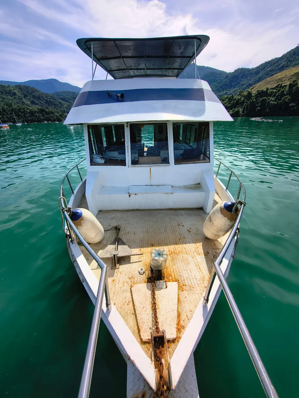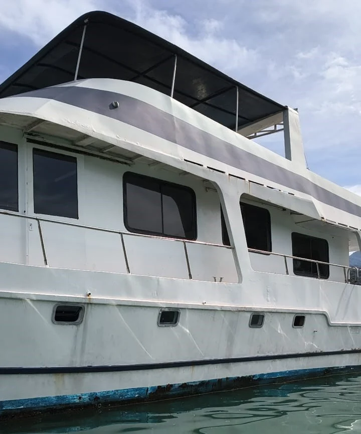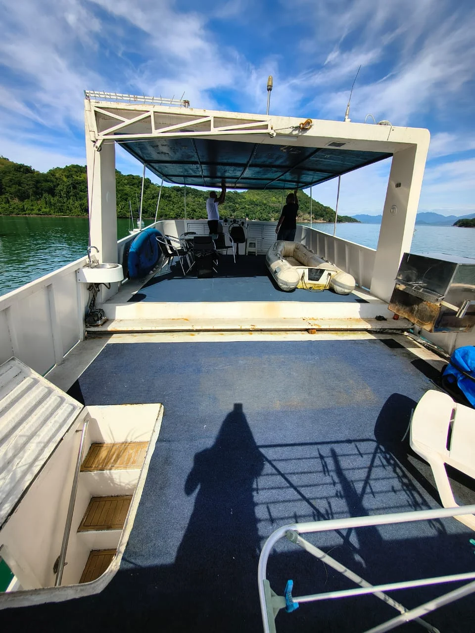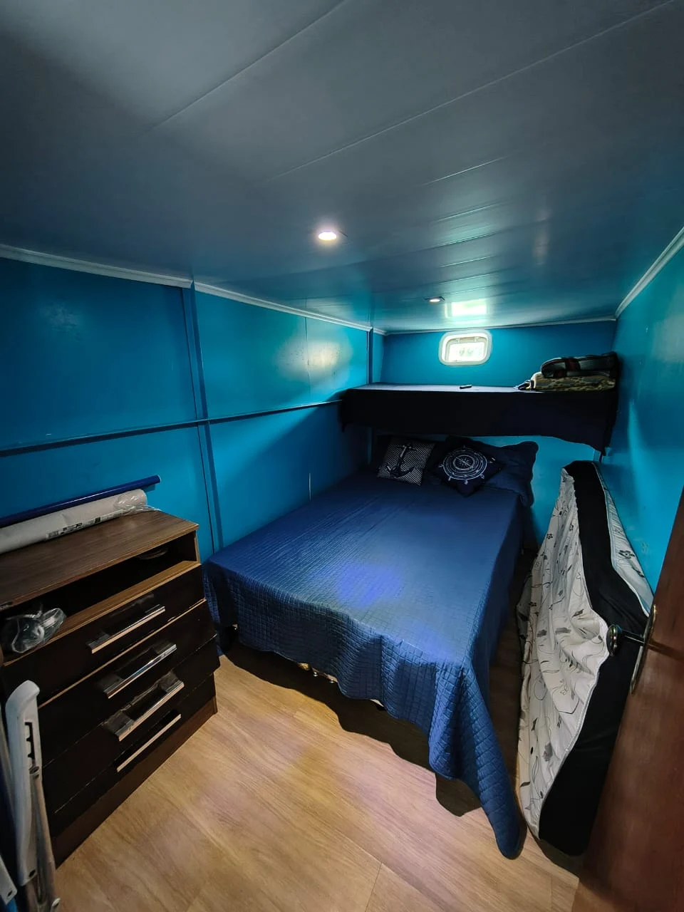 *ESPECIFICAÇÕES TÉCNICAS* Material: Aço Construção artesanal Comprimento: 16,30m Boca: 4,50m Duplo comando Caldo: 1,20m *LAYOUT* 01 suíte com lavabo, guarda-roupas, cômoda e baú – 14m2 02 camarotes para 03 tripulantes com 6m2 cada Sala comando – 23m2 Fly com churrasqueira, pia com água doce e mesa com 04 cadeiras – 33m2 Cozinha completa – 7m2 Banheiro social com vaso elétrico e box – 3,2 m2 *MOTORIZAÇÃO* Mercedes Bens 352 Turbinado Consumo: 10 l/h *ELETRÔNICOS* Painel Completo Plotter Garmin 50S *ELÉTRICA* Reversora ZF 2X1 02 baterias de 150amp (01 motor e 01 embaixo do guincho) 04 paineis solares de 320 w cada com 03 controladores Split 9.000 Btus (sem ligar desde 2023) Split 18.000 Btus (sem ligar desde 2023) Split 12.000 Btus (sem ligar desde 2023) Inversor Koup 4000 220 wats Banco de baterias – 600 amperes *HIDRÁULICA* Tanque de água: 1000 litros 02 bombas pressurizadas de água doce 01 bomba pressurizada de água salgada Chuveiro a gás *ANCORAGEM / FUNDEIO* Âncora Roca 50kg Âncora reserva Danforth 30 kg 55 m de corrente de 10mm *INFORMAÇÕES ADICIONAIS* Lava roupas 8kg Prancha Standup 02 botijões de gás 13kg TV Smart 32” Geladeira Duplex inoperante