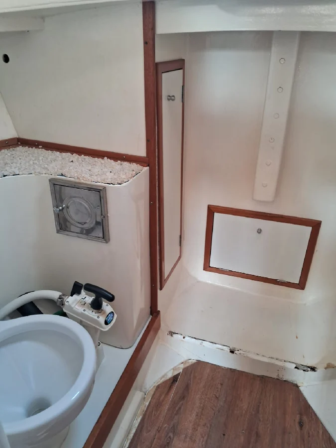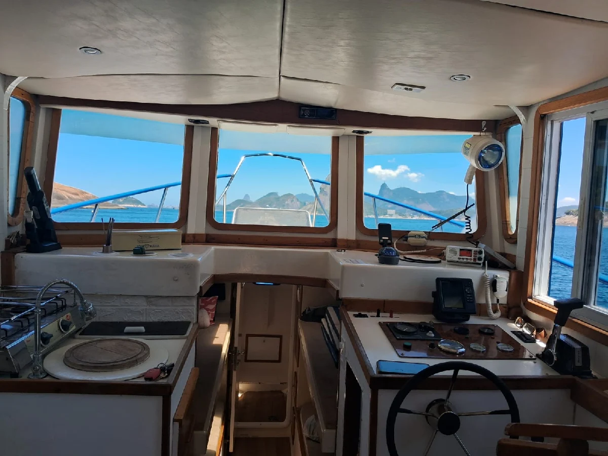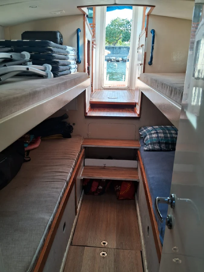 *ESPECIFICAÇÕES TÉCNICAS* Southern Voyager 28 Comprimento Total: 8.70 m Comp. de linha d'água efetivo: 7.34 m Boca máxima: 3.52 m Calado 0.62 m Projeto: Roberto Mesquita de Barros (Cabinho) – Documentação com planos originais fornecidos pelo projetista. Método Construtivo: Strip Planking/epóxi. *LAYOUT* 01 cabine Banheiro na proa Salão com cozinha Praça de popa Plataforma externa de acesso. *MOTORIZAÇÃO* Marca: Volvo Modelo: MD2040 – 40 HP Número de horas: 300 (estimativa) Potência: 40 hp Ano: 2014 Combustível: diesel Propulsão: pé de galinha Tipo de Helice: 3 pas fixa Filtros raccor Velocidade de Cruzeiro 6 nós / A 2500 rpm / Consumo 3 L/h *ELETRÔNICOS* GPS / Plotter: Garmin (cartas da costa brasileira) Bússola VHF *ELÉTRICA* 02 Baterias de 150 AH Carregador Placa Solar Shore power *HIDRÁULICA* Boiler 04 bombas de porão Pressurização *SALVATAGEM / APOIO* Bote de propileno (2,5m) Motor de 5HP Motor de 10 HP de backup Salvatagem (14 +1) *ANCORAGEM / FUNDEIO* Guincho elétrico Âncoras *INFORMAÇÕES ADICIONAIS* 02 beliches (Casal + Solteiro – total p/ pernoite de 6 pessoas) Vários armários. Sofá e ponto de comando Bancos em “L” Pia e caixa de gelo Escada de popa com 5 degraus Turco de popa Televisão Geladeira 12v Fogão Som Toldo horizontal (fechamento da popa) Lemo hidráulico (com redundância de sistema de cabos/quadrante) Costado pintado em 2024 Fundo ok Faixas ok Tinta venenosa cobre com epoxi