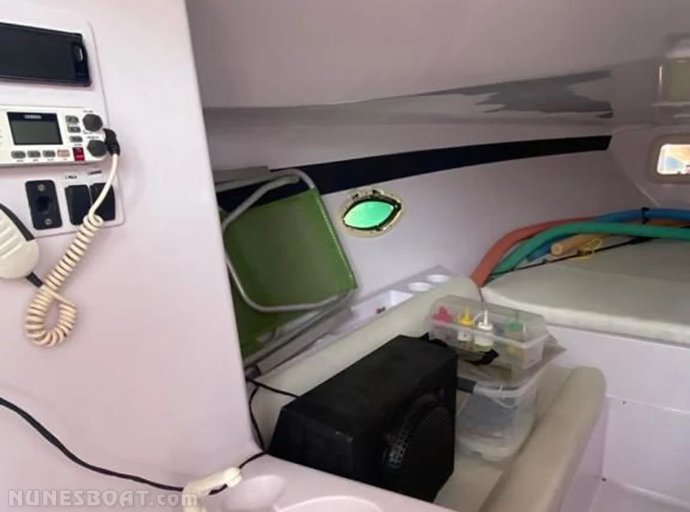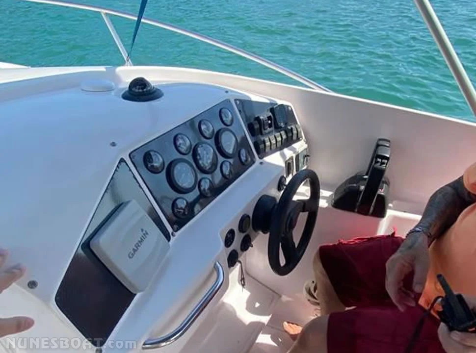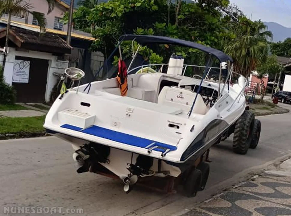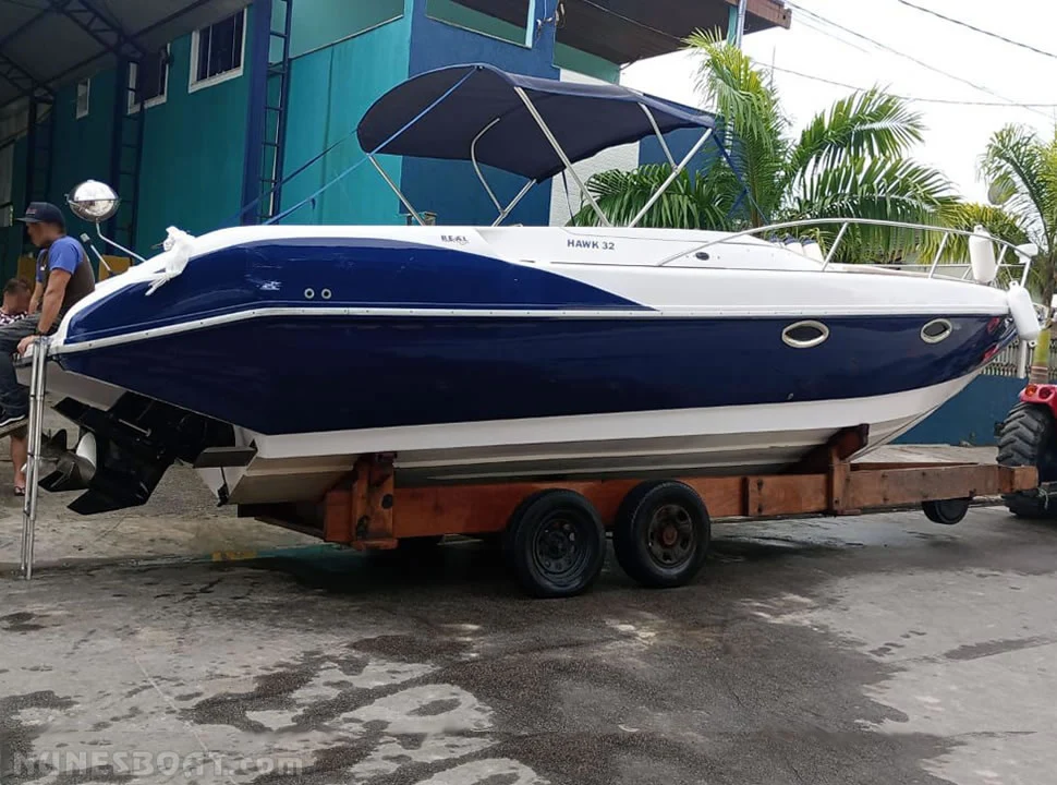 CÓD 5324 REAL HAWK 32: 1999, 2x mercruiser 5.7 v8 350hp, gasolina, rabetas bravo one, 43 top e 31 cruzeiro, âncora, baterias, bomba de água doce, (2) bombas de porão, bússola, capota, carreta de encalhe, churrasqueira, (11) coletes, (6) defensas, direção hidráulica, farol, flap hidráulico, gps c/plotter, guincho elétrico, rádio vhf, sanitário elétrico, som, teca... F/c. Nunes (13)99706-0395
