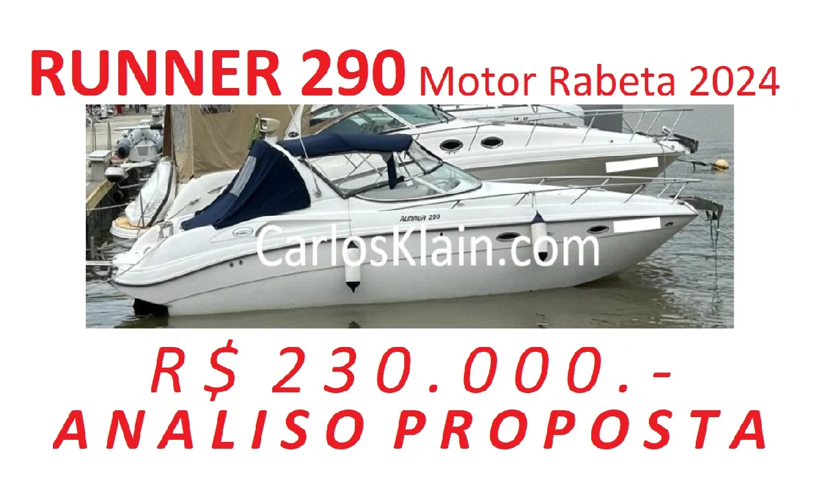 RUNNER 290 TARGA CABINE R$ 230.000.- SEGUNDO DONO Ano 2002 Casco Material FIBERGLASS (GRP) Comprimento 8,94Mts. Boca 2,76Mts. MOTORIZAÇÃO (JULHO 2024) 1 MERCRUISER 350 MAG 6.2L DTS V8 gasolina 4T 300Hp. Transmissão RABETA BRAVO III MERCRUISER EXTERIOR Luzes navegação CONVES Âncora / Guincho elétrico / Gaiuta COCKPIT Bimini com fechamento transparente laterais e popa Targa / Luzes Piso forrado com borracha Mesa com Sofá em U / Estofamentos / Altofalantes / Pia / Geladeira Posto de Comando: Poltrona / Roda de leme / Comandos / Relógios de Motores / Plotter Multifunção / Rádio VHF / Bussola Painel elétrico / Controle Guincho Âncora / Controle Faro guia / Poltronas POPA Pranchada fiberglass / Chuveiro / ShorePower / Escada inox INTERIOR Cabine (refit 2023) Luzes / Vigias / Som / Geladeira (gelo) / Forno Microondas / Cama casal Banheiro Social completo: Pia / Vaso sanitário / Espelho / Duchinha / Vigia VARIOS Instalação de componentes NOVOS: Motor / Rabeta completa / Relógios / Cabo Direção / Caixa Direção / Manete Eletrônico (JULHO 2024) 2 Baterias / Inversor / Bombas de Porão automática / Suporte para motor de popa auxiliar (pranchada) / Âncora auxiliar / Farol guia / Salva-vidas – Bóia – Defensas Cobertura completa Valor R$ 230.000.- Mais informações: CARLOS MARCELO KLAIN Broker Náutico NITEROI / RIO / ANGRA DOS REIS / PARATY - RJ - BRASIL Facebook: @carlosmarceloklain Cel / Whatsapp +55 24 98851 7880 info@carlosklain.com CarlosKlain.com