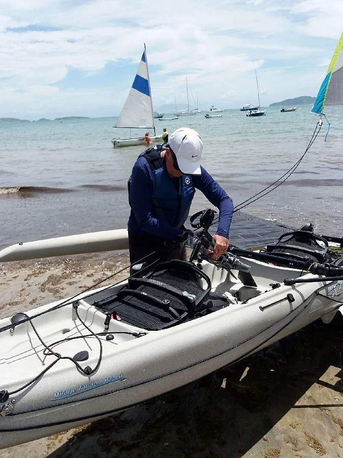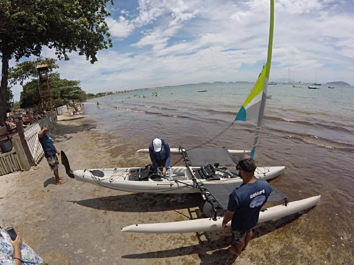 Vendo HOBIE MIRAGE TANDEM ISLAND, caiaque veleiro trimaran. Vela de 8,4m² com mastro de carbono e enrolador, não tem estaiamento. Medidas: 5,64 m (18 pés) de comprimento 3,05m com Amas Laterais Abertas 1,22 m Amas Fechadas Sistema de Pedal MirageDrive 180 (dois pedais traseiro e dianteiro) Assentos Vantage CT com diversas regulagens Escotilhas para guarda de material Suportes de vara embutidos Trampolins montados nas Amas Carretinha Dune Beach para colocar na água e retirar Dois remos Hobie Bolina no casco central Leme Retrátil Peso montado 59kg Deslocamento máximo de 272 kg