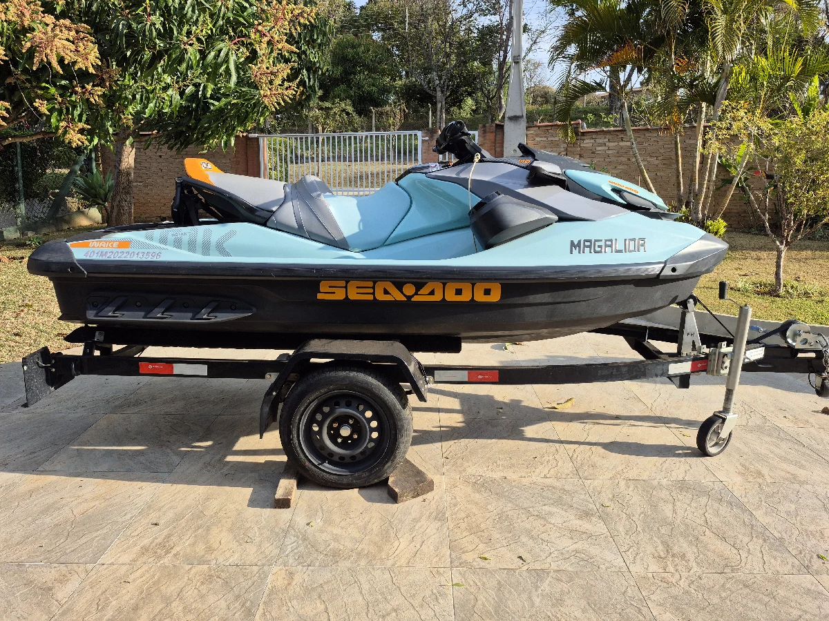 Vendo jet ski Sea-Doo Wake 170 ano 2022, em excelente estado de conservação! Este modelo, Wake 170, pode ser utilizado para prática esportes aquáticos (wakeboard, esqui, boias). Motor potente de 170 cavalos de potência, 3 cilindros, aspirado, muito confiável e de baixíssima manutenção. Plataforma ampla com excelente estabilidade Sistema próprio para reboque esportivo (torre de esqui) retrátil LinQ. Modo Ski exclusivo para aceleração perfeita em cada reboque, suporte removível para pranchas de Wakeboard, sistema de som BRP Audio-Premium de 100 W Bluetooth à prova d'água, totalmente integrado com o controle remoto no alto-falante esquerdo, você pode alterar rapidamente as músicas e o volume. Conforto e desempenho incomparáveis. Display digital de 4,5" com múltiplas funções (velocímetro, RPM, autonomia, relógio, entre outras). Sistema de trim variável (VTS™) para ajustes de manobra. Acompanha carreta rodoviária ano 2022, documentação toda ok, e pronta para viajar. Jet ski pronto para uso, só pegar e curtir! Excelente oportunidade para quem busca um equipamento moderno, forte e praticamente novo. - Apenas 84 horas de uso, utilizado exclusivamente em água doce (represa Jaguari), muito bem cuidado, todo original. - Todas revisões realizadas em concessionária Sea Doo. - Único dono. - Capacidade para 3 pessoas embarcadas. - Sistema de som Bluetooth Sea Doo Audio Premium. - Escada para embarque e desembarque. - Carreta rodoviária Free Robby FH20, em alumínio, 2022, com licenciamento 2026 - Nota fiscal de compra do Jet e carreta. - Manual de instruções. Não aceito troca. Jet Ski em Joanópolis/SP a 120 km de São Paulo. Interessados, entrar em contato para mais informações.