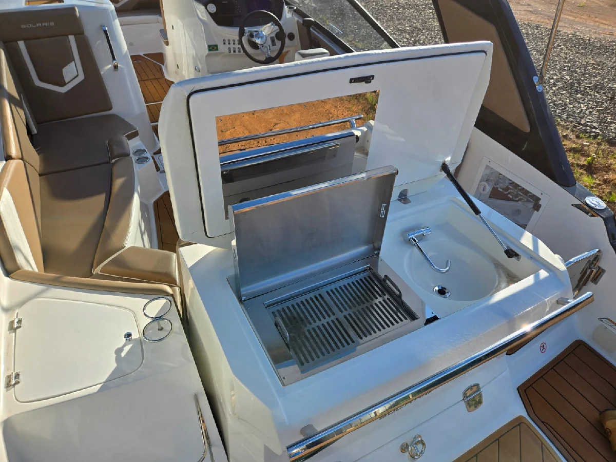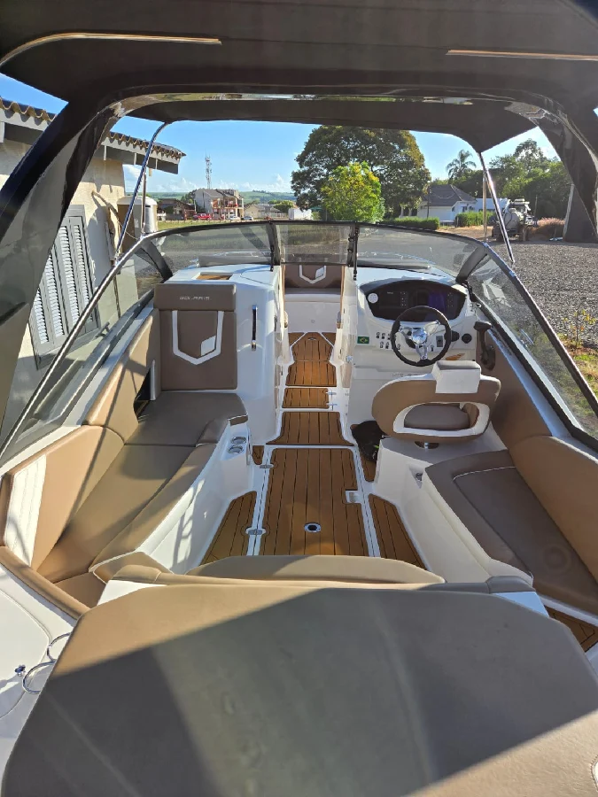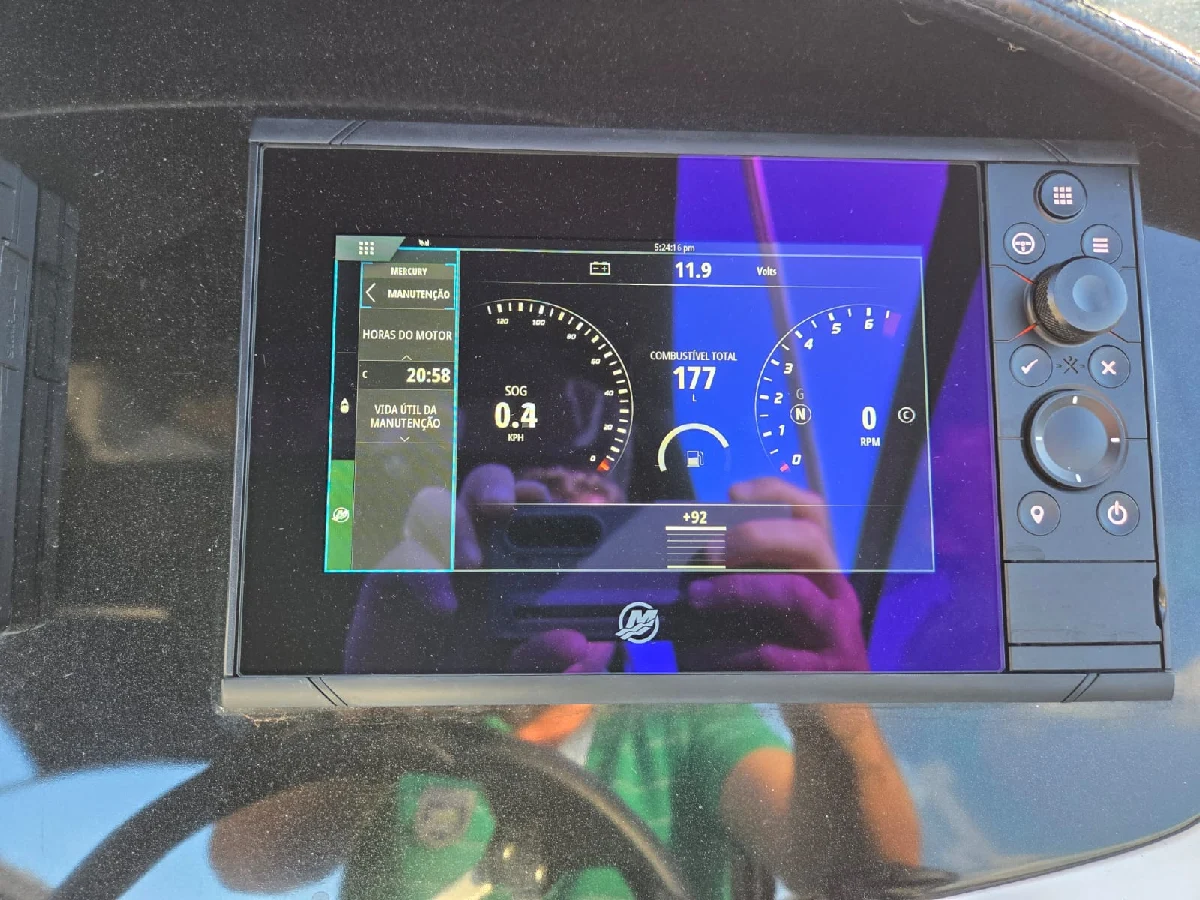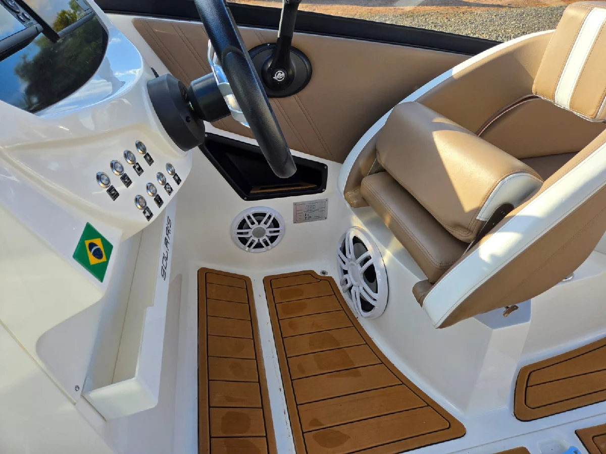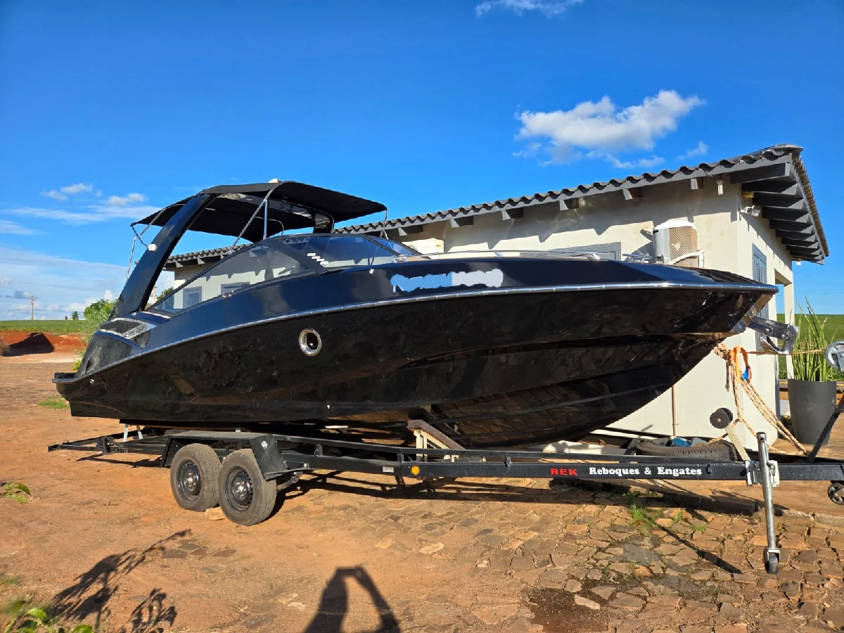 Lancha FS 265 solaris 2022 preta platinum, com motor 6.2 V8 300hp Mercury completa, com churrasqueira, GPS com sonda SIMRAD 5", Farol de navegação, 01 bateria de serviço e 03 de acessórios, deck EVA, guincho elétrico de 7,5kg, mesa de centro, Sonar, colchão e ventilador no paiol, luzes subaquáticas, puxador de esqui, kit de salvatagem completo. Acompanha reboque rodoviário 2 eixos Rek.