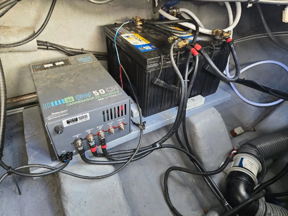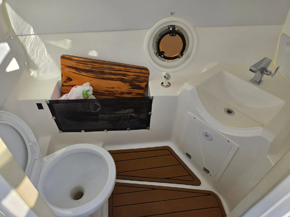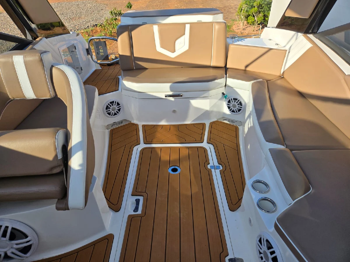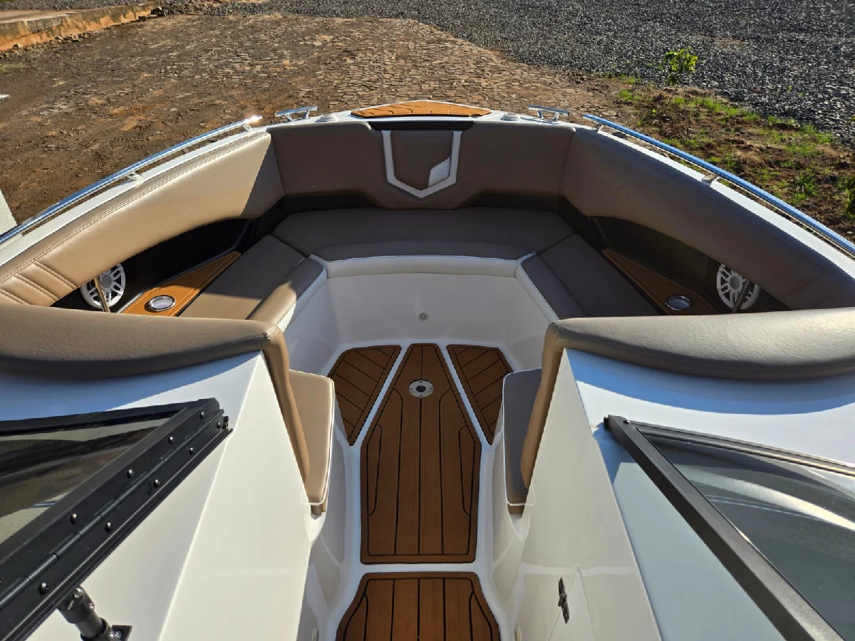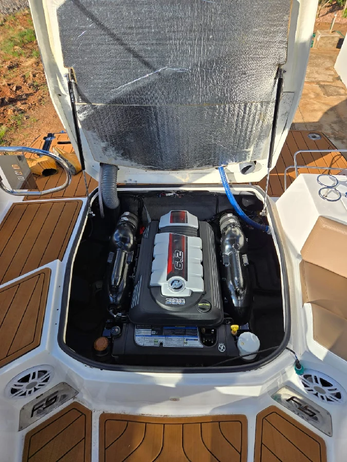 Lancha FS 265 solaris 2022 preta platinum, com motor 6.2 V8 300hp Mercury completa, com churrasqueira, GPS com sonda SIMRAD 5", Farol de navegação, 01 bateria de serviço e 03 de acessórios, deck EVA, guincho elétrico de 7,5kg, mesa de centro, Sonar, colchão e ventilador no paiol, luzes subaquáticas, puxador de esqui, kit de salvatagem completo. Acompanha reboque rodoviário 2 eixos Rek.