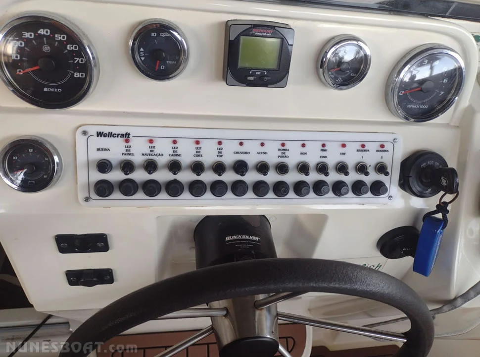 CÓD 2581 WELLCRAFT 26: proa aberta, 2008, mercury verado 300hp, gasolina, âncora, baterias, bomba de água doce, (3) bombas de porão, bússola, capota t-top em inox, carregador de bateria, carreta de encalhe, chuveiro de popa, coletes, defensas, direção hidráulica, farol, flap hidráulico, geleira, gps c/plotter, guincho elétrico, rádio vhf, sanitário, som, teca eva... F/c. Nunes (13)99706-0395
