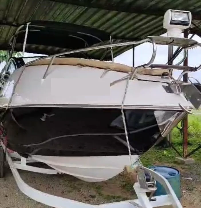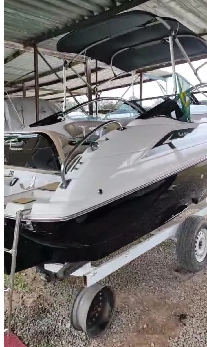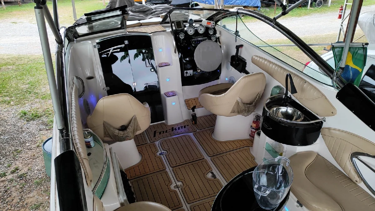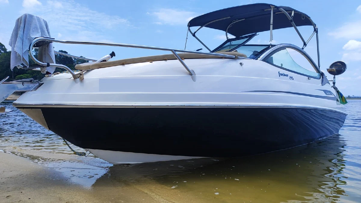 Lancha Focker 215 com motor Mercury Optimax 150 HP - Inclusos: buzina em aço inox; farol de busca; sonar Garmin; rádio VHF. som Pioneer MXH5000; Smart TV 32''; 3 baterias de 105ah; 2 bombas de porão Rule; pressurizador de água doce 30l; 8 luzes de cortesia em leds azuis no convés; inversor; mesa de centro; âncora em aço inox; escada em aço inox; churrasqueira em aço inox; motor Mercury Optimax 150 HP com 105 hs; hélice em aço inox Bravo com 4 pás; fechadura digital na cabine; vaso sanitário elétrico; capota com ferragens em aço inox e carreta galvanizada com roda de 18".