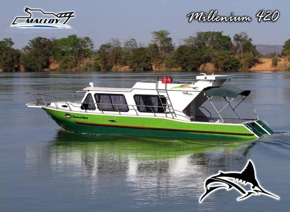 Lancha de duralumínio Malloy modelo Millenium 420 - Um projeto desenvolvido pela Malloy para os amantes da pesca esportiva em rios de baixo calado e lagos. Possui dormitório, cozinha, banheiro e solário de popa. Uma embarcação compacta, com estilo agradável, ótima navegabilidade e custo-benefício. Feita sob encomenda, pode ser customizado todo o seu espaço interno. Tratar com Mara pelo WhatsApp 82 99153 3096. FOTOS ILUSTRATIVAS.