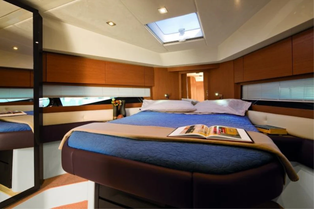 Duas suítes, um salão central com cozinha que pode acomodar mais um casal e uma praça de popa monstro com pia e churrasqueira elétrica.