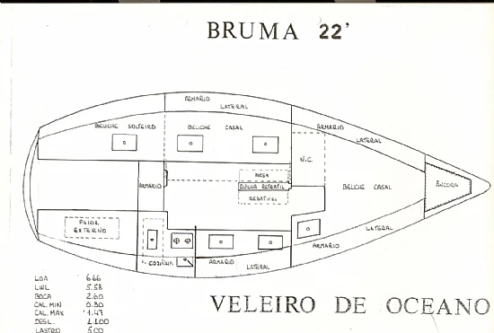 Muito bom veleiro construido na forma do ótimo Main 22 projeto de Nestor Volker era construído pelo Aquilys de Florianopolis que 1986 passou a ser fabricado pela Bruma em P.Alegre, recomendo a compra.