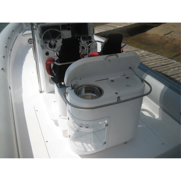 Barzinho: Móvel em fibra de Vidro equipado com: Pia, torneira rebatível caixa térmica para gelo, (tipo cooler), tampa (quando fechada), formando um balcão e armário sob a pia com suporte para garrafas e potes. Opcionalmente poderá ser instalado no barzinho fogão elétrico de uma boca, geladeira elétrica, ou forno de Micro Ondas porem será necessário a instalação de um gerador de 110v, também opcional, no porão de popa.