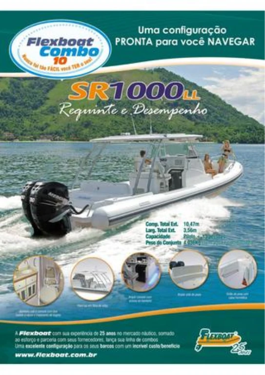 Brasil O maior e mais luxuoso Flexboat da linha, é o mais desejado por quem não abre mão de espaço, conforto e conveniência a bordo. Inspirado dos ‘gommones’ (barcos infláveis italianos), o SR 1000 traz em seu DNA toda a tradição, qualidade, robustez e tecnologia que a FLEXBOAT disponibiliza em todos os barcos que produz.