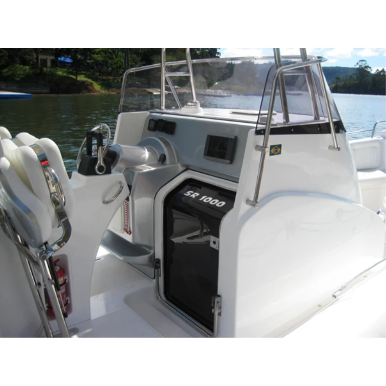 Console de comando. Permite a instalação dos instrumentos necessários aos motores. Amplo pára-brisa abrigando bem o piloto e o co-piloto do vento, suporte para bússola de embutir, corrimão em aço inox ao redor da console.
