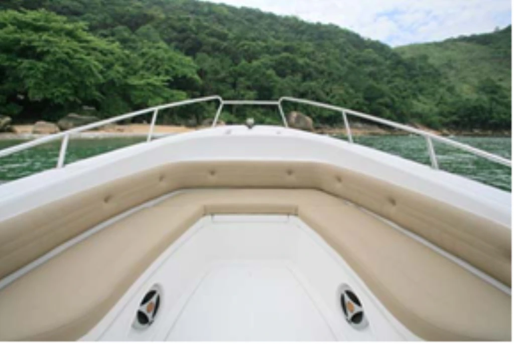 Sofá de popa todos estofado com assento para 04 pessoas, contendo bagageiro de popa extremamente espaçoso, com espaço para fixação de equipamentos gerais como: bateria, filtro separador de gasolina, bomba de porão e deposito para salvatagem. Contém também uma geladeira térmica de 70 litros com volume total de 850 litros.