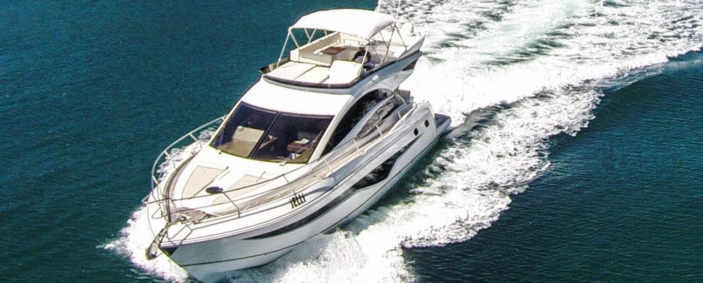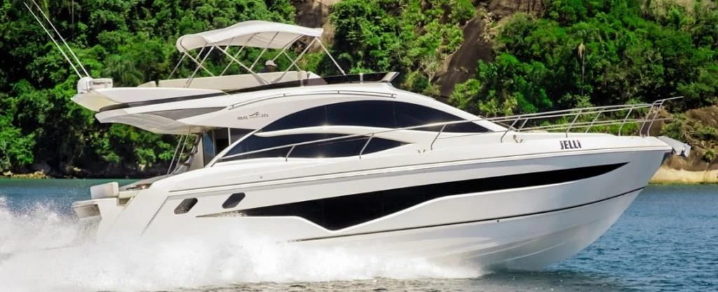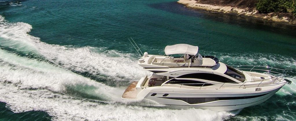 - Targa em fibra de vidro, com mastro de bandeira em aço inox, antena de TV, antena de VHF, luz de top, luz de strobo e antena de piloto automático (caso a motorização seja Cummins)