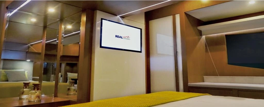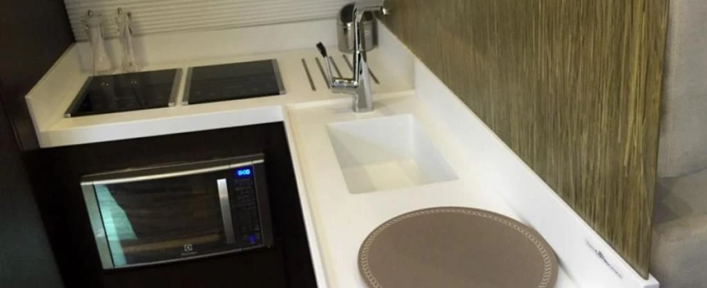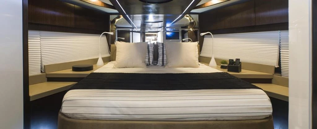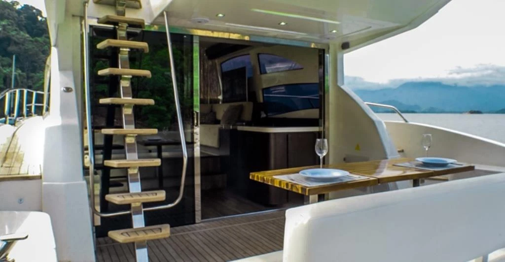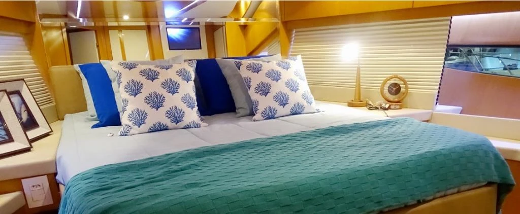 - Sistema de ar condicionado de 64.000 BTU composto por quatro aparelhos independentes localizados na sala, cozinha, suíte de proa e suíte master.