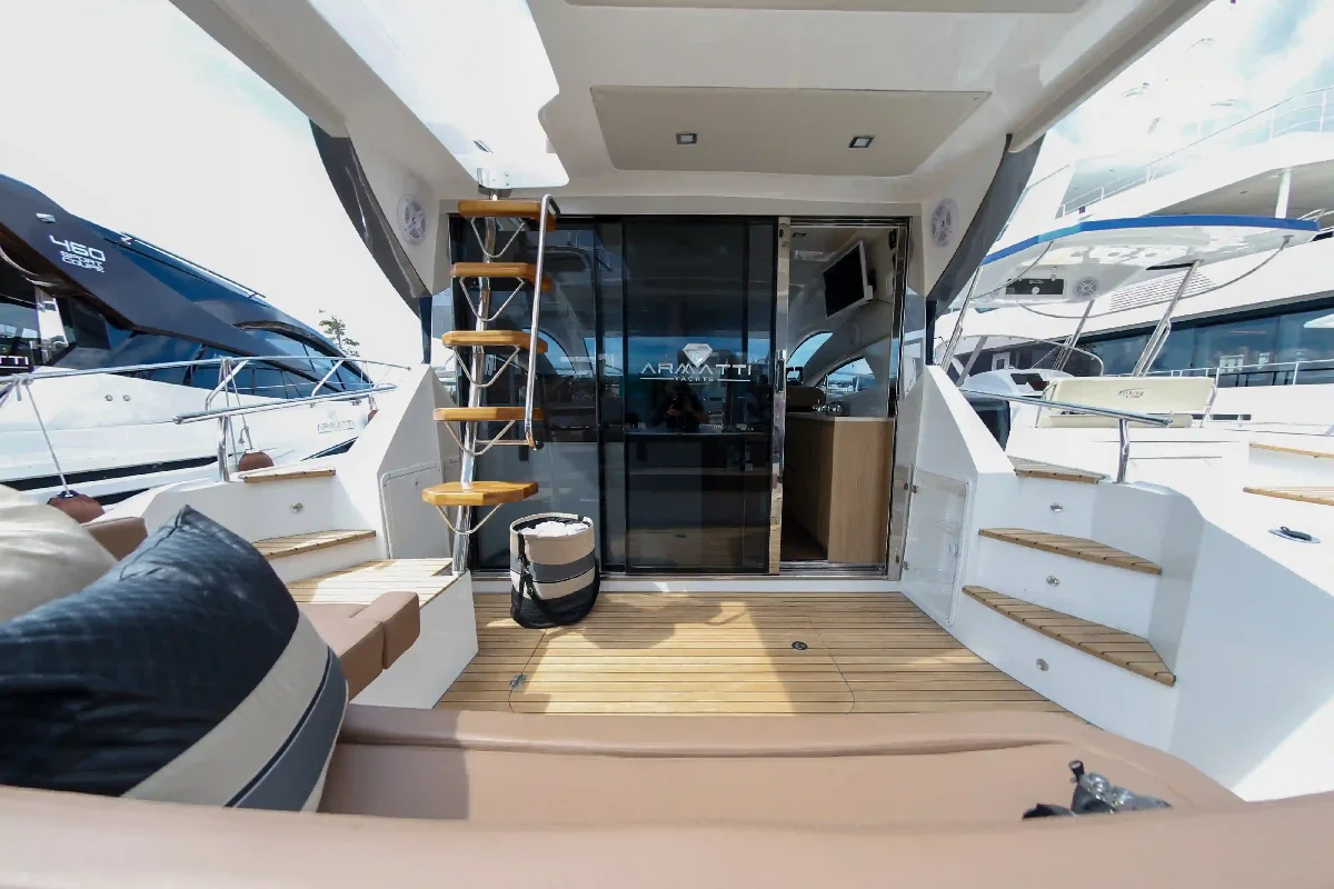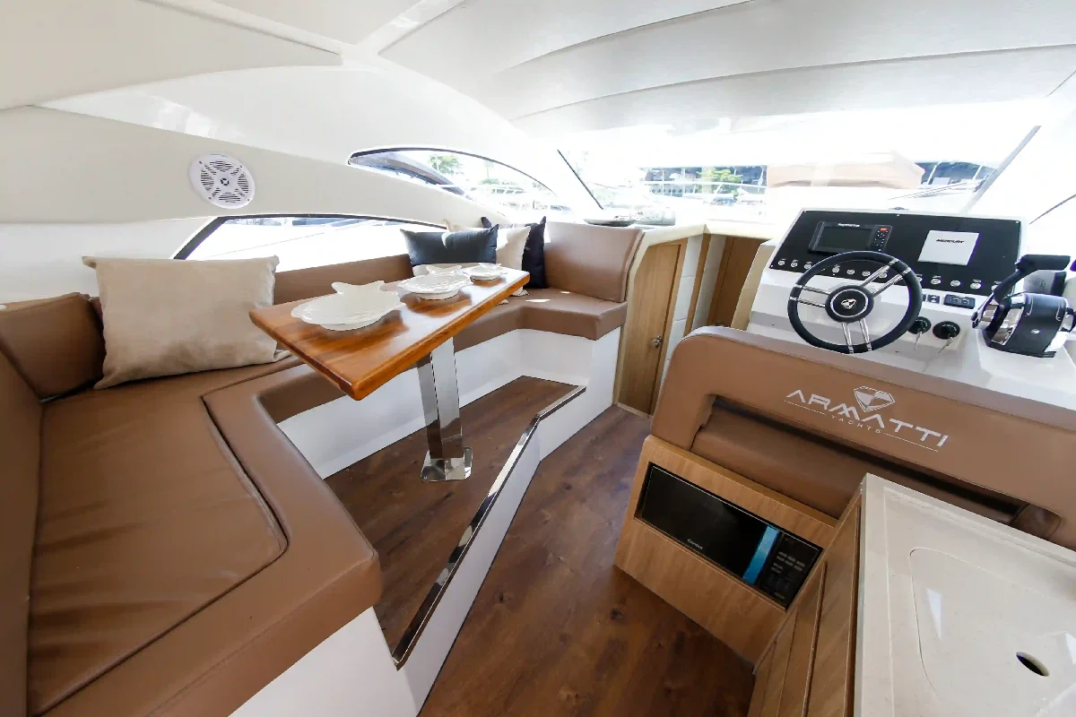 A **Armatti 420 Sport Fly** é uma síntese de sofisticação e design contemporâneo, consolidando a Armatti Yachts como uma referência de luxo no mercado náutico brasileiro. Com linhas aerodinâmicas e um perfil imponente, esta cabinada destaca-se pelo equilíbrio perfeito entre a esportividade de uma lancha *sport* e a amplitude proporcionada pelo generoso *flybridge*.