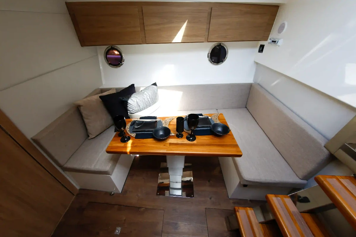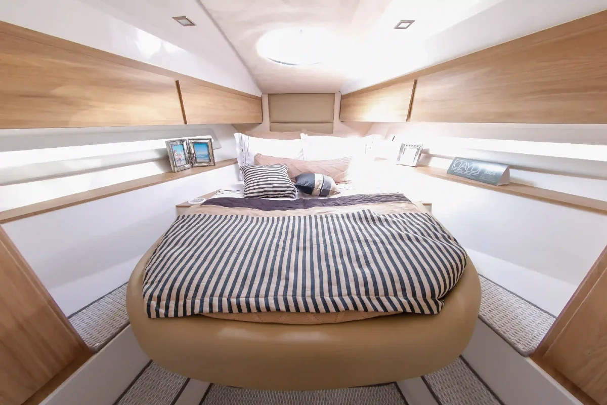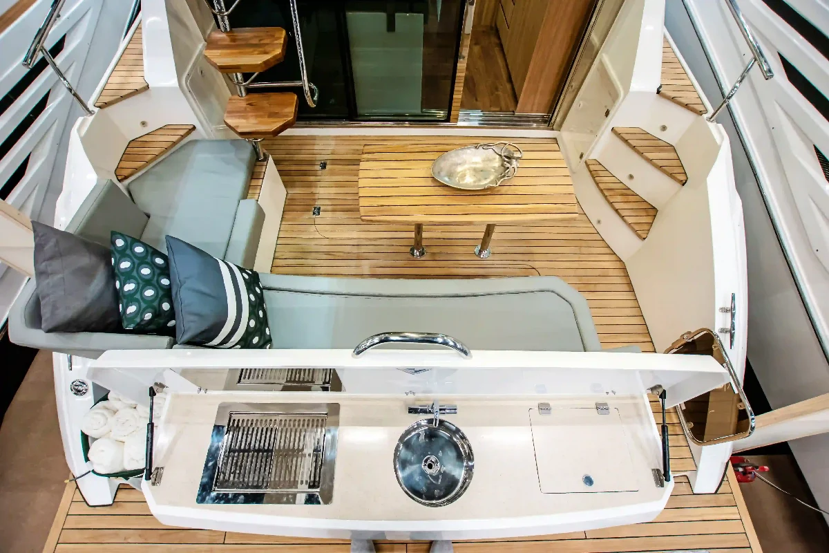 No interior, o acabamento primoroso e a atenção aos detalhes revelam o DNA premium da marca, garantindo pernoites confortáveis e uma experiência de hotelaria sobre as águas. Em termos de performance, a 420 Sport Fly entrega uma navegação estável e ágil, sendo a escolha ideal para quem busca elegância e versatilidade para explorar o litoral brasileiro com estilo.